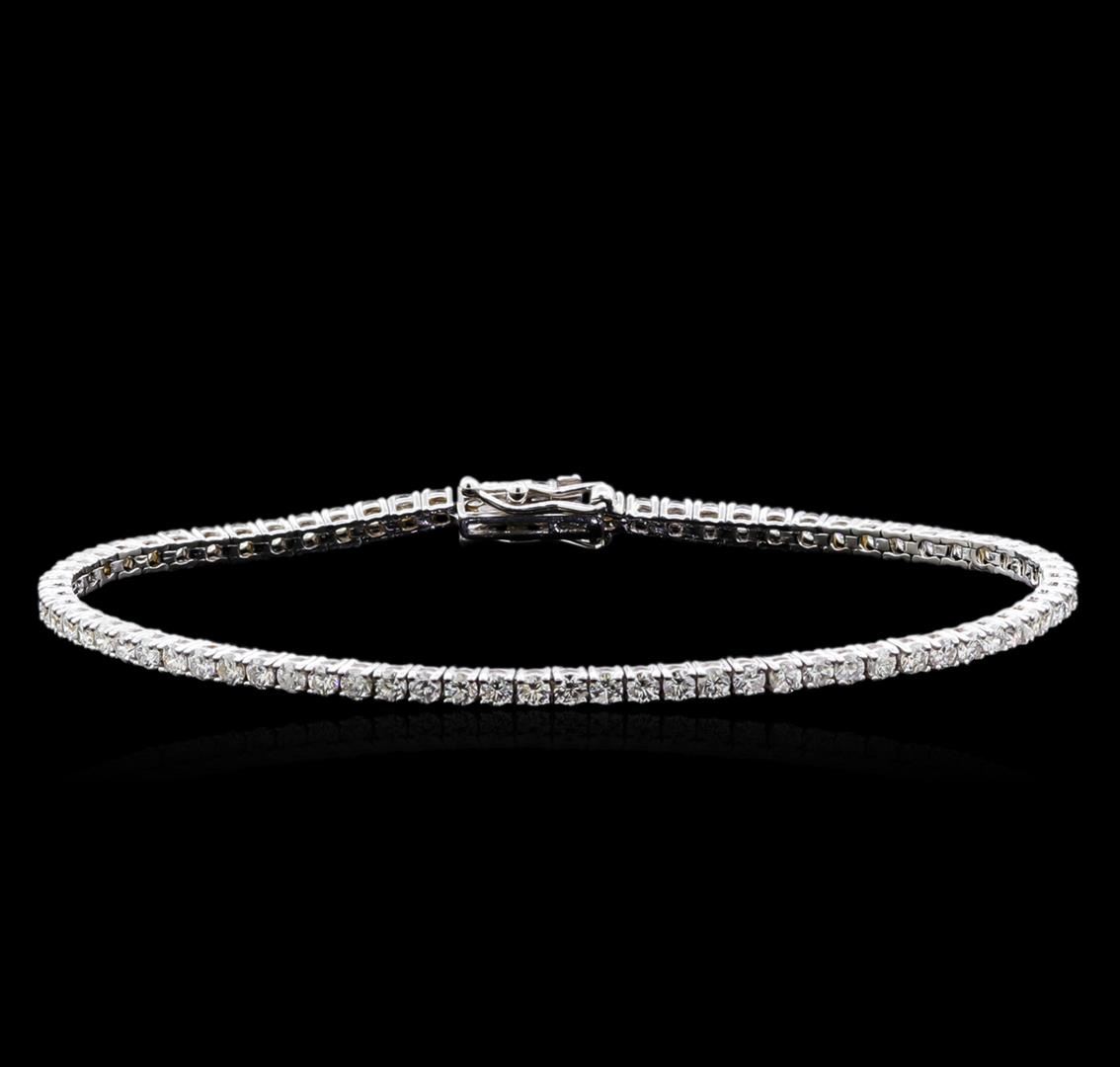 One 18KT white gold 3.20ctw diamond bracelet. Metal: 18KT solid white gold. Face Measurements: 2.5 x 180mm. Size: 7. Finish: Bright polish. Total item weight: 7.0 grams. Markings: Stamped 18K. Country Made: USA. Main Stone: Diamond. Quantity: 75. Shape: Round. Color: White. Carat Total Weight: 3.20ct. Measurements: 2.2mm. Treatment: None. Setting: Prong. Color Grade: G - H. Clarity: SI1 - SI2. Cut: Very good. Condition: Excellent workmanship. Gemstones graded in the mounting. BHGL Appraised at $12,400.00.