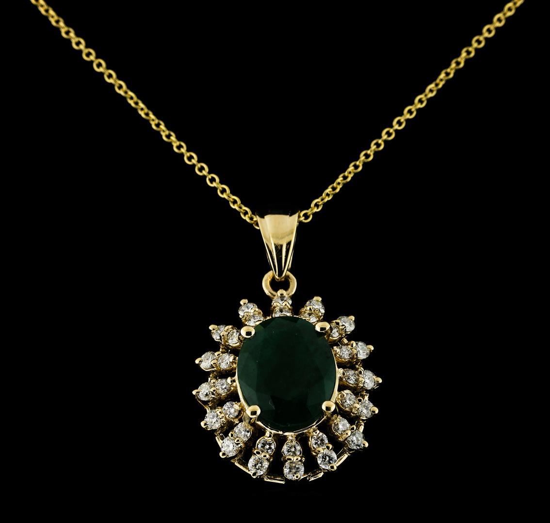 One electronically tested 14KT yellow gold lady's combination cast & assembled fashion pendant & chain 18.0' long, 1.3mm round cable link with a lobster claw clasp with a double halo with a bright polish finish. Identified with markings of '14K'. Condition is new, good workmanship. Containing: One prong set oval modified mixed cut natural emerald, measuring 11.90 x 9.60 x 4.33mm, (depth est.) 12%. bulge factor, approximate weight of 3.20ct., clarity is heavily included, medium dark, moderately strong, green color, (GIA G 6/4), cut is good. Transmitting light somewhat diffusely, semi-transparent to translucent. Indications of oil residue. Naturally occurring internal & external characteristics are present. Colored gemstones are presumed to have been subjected to commonly used enhancement processes. Graded in the setting. Sixteen prong set round brilliant cut diamonds, measuring 2.00 - 1.90 x 1.19mm (depth est.) approximate total weight of 16 Stones = 0.44ct. Graded in the setting. Clarity SI-1 to SI-3. Color: G - I Cut Good Sixteen prong set round brilliant cut diamonds, measuring 1.70 - 1.60 x 1.02mm (depth est.) approximate total weight of 16 Stones = 0.27ct. Graded in the setting. Clarity SI-1 to SI-2. Color: G - I Cut Good. Total Weight of Colored Stones 3.20ct.. Total Weight of Diamonds 0.71ct.. Total Weight of Pendant & Chain 6.60gm. GAS Appraised.