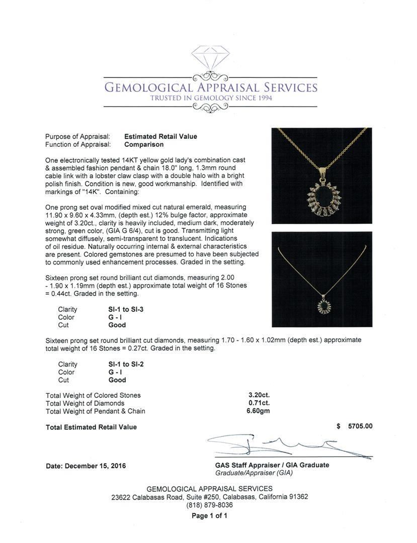 One electronically tested 14KT yellow gold lady's combination cast & assembled fashion pendant & chain 18.0' long, 1.3mm round cable link with a lobster claw clasp with a double halo with a bright polish finish. Identified with markings of '14K'. Condition is new, good workmanship. Containing: One prong set oval modified mixed cut natural emerald, measuring 11.90 x 9.60 x 4.33mm, (depth est.) 12%. bulge factor, approximate weight of 3.20ct., clarity is heavily included, medium dark, moderately strong, green color, (GIA G 6/4), cut is good. Transmitting light somewhat diffusely, semi-transparent to translucent. Indications of oil residue. Naturally occurring internal & external characteristics are present. Colored gemstones are presumed to have been subjected to commonly used enhancement processes. Graded in the setting. Sixteen prong set round brilliant cut diamonds, measuring 2.00 - 1.90 x 1.19mm (depth est.) approximate total weight of 16 Stones = 0.44ct. Graded in the setting. Clarity SI-1 to SI-3. Color: G - I Cut Good Sixteen prong set round brilliant cut diamonds, measuring 1.70 - 1.60 x 1.02mm (depth est.) approximate total weight of 16 Stones = 0.27ct. Graded in the setting. Clarity SI-1 to SI-2. Color: G - I Cut Good. Total Weight of Colored Stones 3.20ct.. Total Weight of Diamonds 0.71ct.. Total Weight of Pendant & Chain 6.60gm. GAS Appraised.