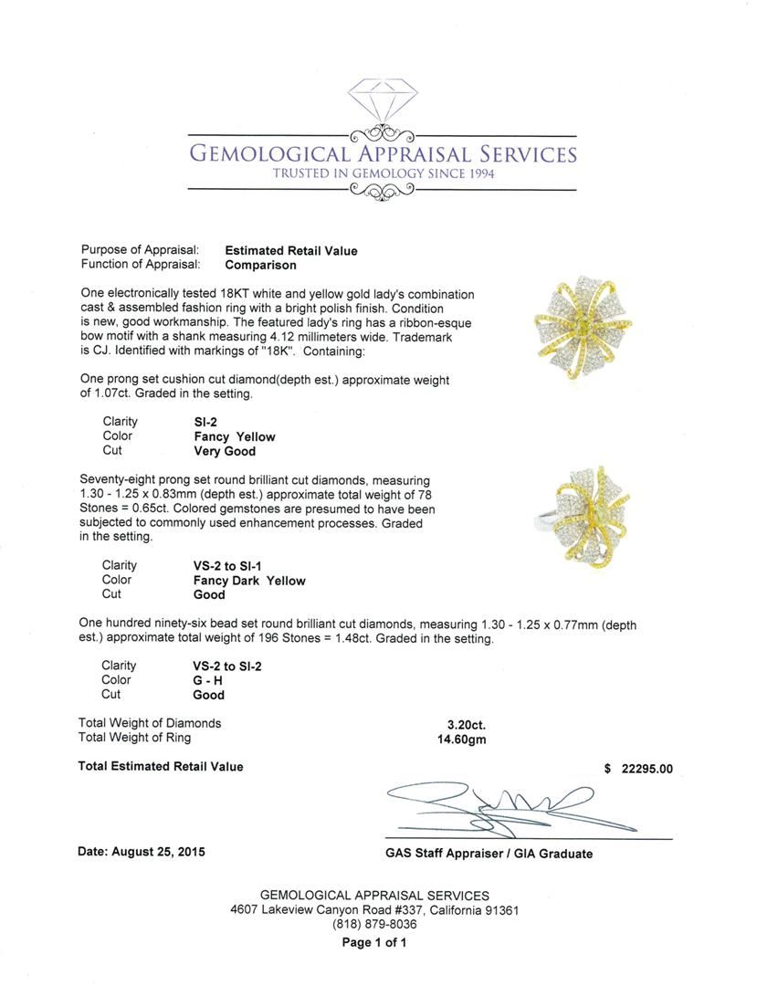 One electronically tested 18KT white and yellow gold lady's combination cast & assembled fashion ring with a bright polish finish. The featured lady's ring has a ribbon-esque bow motif with a shank measuring 4.12 millimeters wide. Trademark is CJ. Identified with markings of "18K". Condition is new, good workmanship. Containing: One prong set cushion cut diamond(depth est.) approximate weight of 1.07ct. Graded in the setting. Clarity: SI-2 Cut Very Good Seventy-Eight prong set round brilliant cut diamonds, measuring 1.30 - 1.25 x 0.83mm (depth est.) approximate total weight of 78 Stones = 0.65ct. Colored gemstones are presumed to have been subjected to commonly used enhancement processes. Graded in the setting. Clarity: VS-2 to SI-1 Cut Good One Hundred Ninety-Six bead set round brilliant cut diamonds, measuring 1.30 - 1.25 x 0.77mm (depth est.) approximate total weight of 196 Stones = 1.48ct. Graded in the setting. Clarity: VS-2 to SI-2. Color: G - H. Cut Good. Total Weight of Diamonds 3.20ct. Total Weight of Ring 14.60gm. GAS Appraised at $22,295.00.