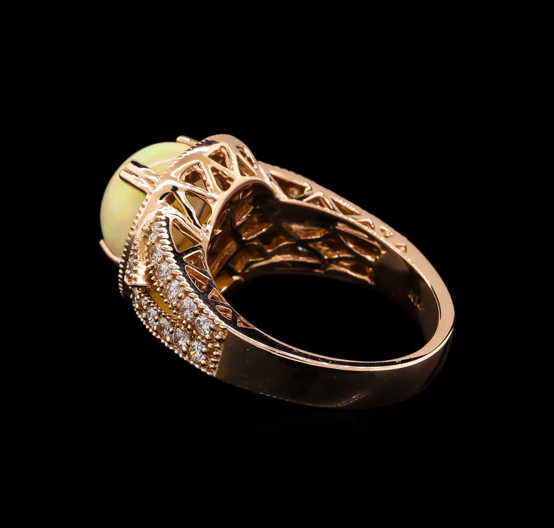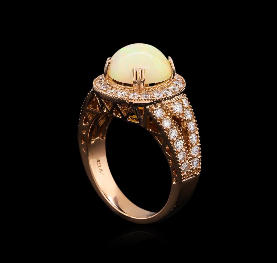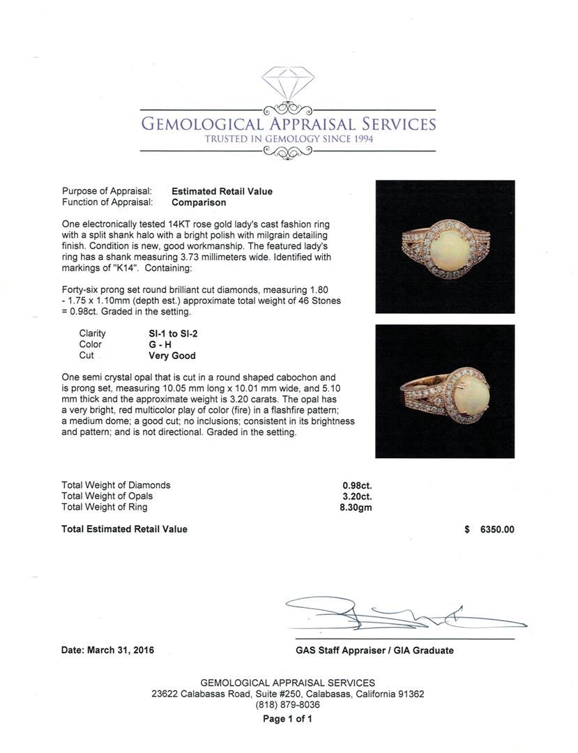 One electronically tested 14KT rose gold lady's cast fashion ring with a split shank halo with a bright polish with milgrain detailing finish. The featured lady's ring has a shank measuring 3.73 millimeters wide. Identified with markings of "K14". Condition is new, good workmanship. Containing: Forty-Six prong set round brilliant cut diamonds, measuring 1.80 - 1.75 x 1.10mm (depth est.) approximate total weight of 46 Stones = 0.98ct. Graded in the setting. Clarity: SI-1 to SI-2. Color: G - Very Good One semi crystal opal that is cut in a round shaped cabochon and is prong set, measuring 10.05 mm long x 10.01 mm wide, and 5.10 mm thick and the approximate weight is 3.20 carats. The opal has a very bright, red multicolor play of color (fire) in a flashfire pattern; a medium dome; a good cut; no inclusions; consistent in its brightness and pattern; and is not directional. Graded in the setting. Total Weight of Diamonds 0.98ct. Total Weight of Opals 3.20ct. Total Weight of Ring 8.30gm GAS Appraised.