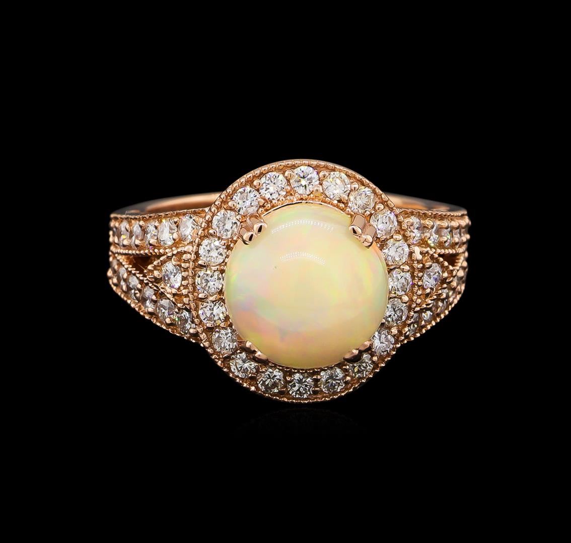 One electronically tested 14KT rose gold lady's cast fashion ring with a split shank halo with a bright polish with milgrain detailing finish. The featured lady's ring has a shank measuring 3.73 millimeters wide. Identified with markings of "K14". Condition is new, good workmanship. Containing: Forty-Six prong set round brilliant cut diamonds, measuring 1.80 - 1.75 x 1.10mm (depth est.) approximate total weight of 46 Stones = 0.98ct. Graded in the setting. Clarity: SI-1 to SI-2. Color: G - Very Good One semi crystal opal that is cut in a round shaped cabochon and is prong set, measuring 10.05 mm long x 10.01 mm wide, and 5.10 mm thick and the approximate weight is 3.20 carats. The opal has a very bright, red multicolor play of color (fire) in a flashfire pattern; a medium dome; a good cut; no inclusions; consistent in its brightness and pattern; and is not directional. Graded in the setting. Total Weight of Diamonds 0.98ct. Total Weight of Opals 3.20ct. Total Weight of Ring 8.30gm GAS Appraised.
