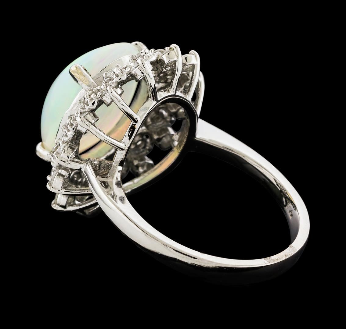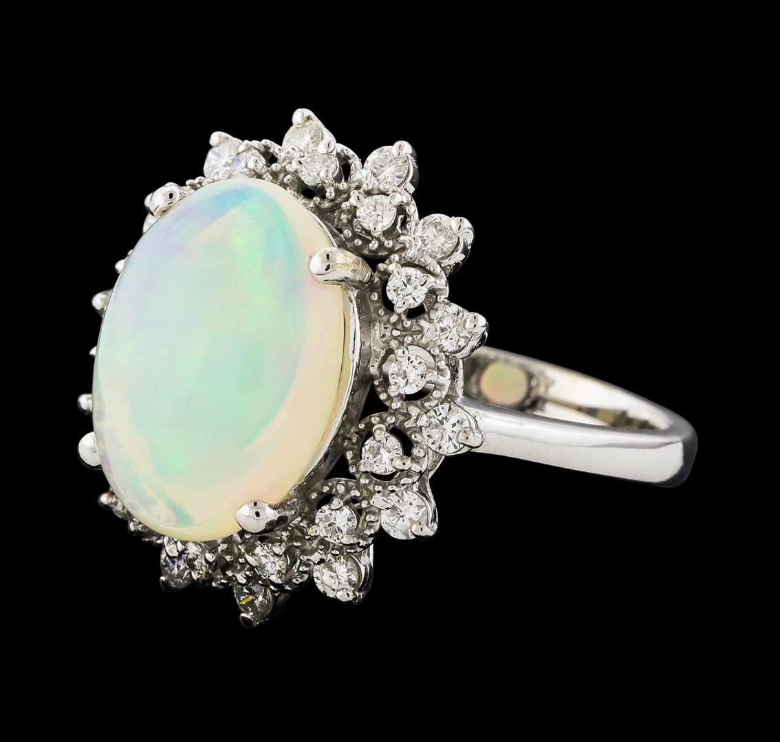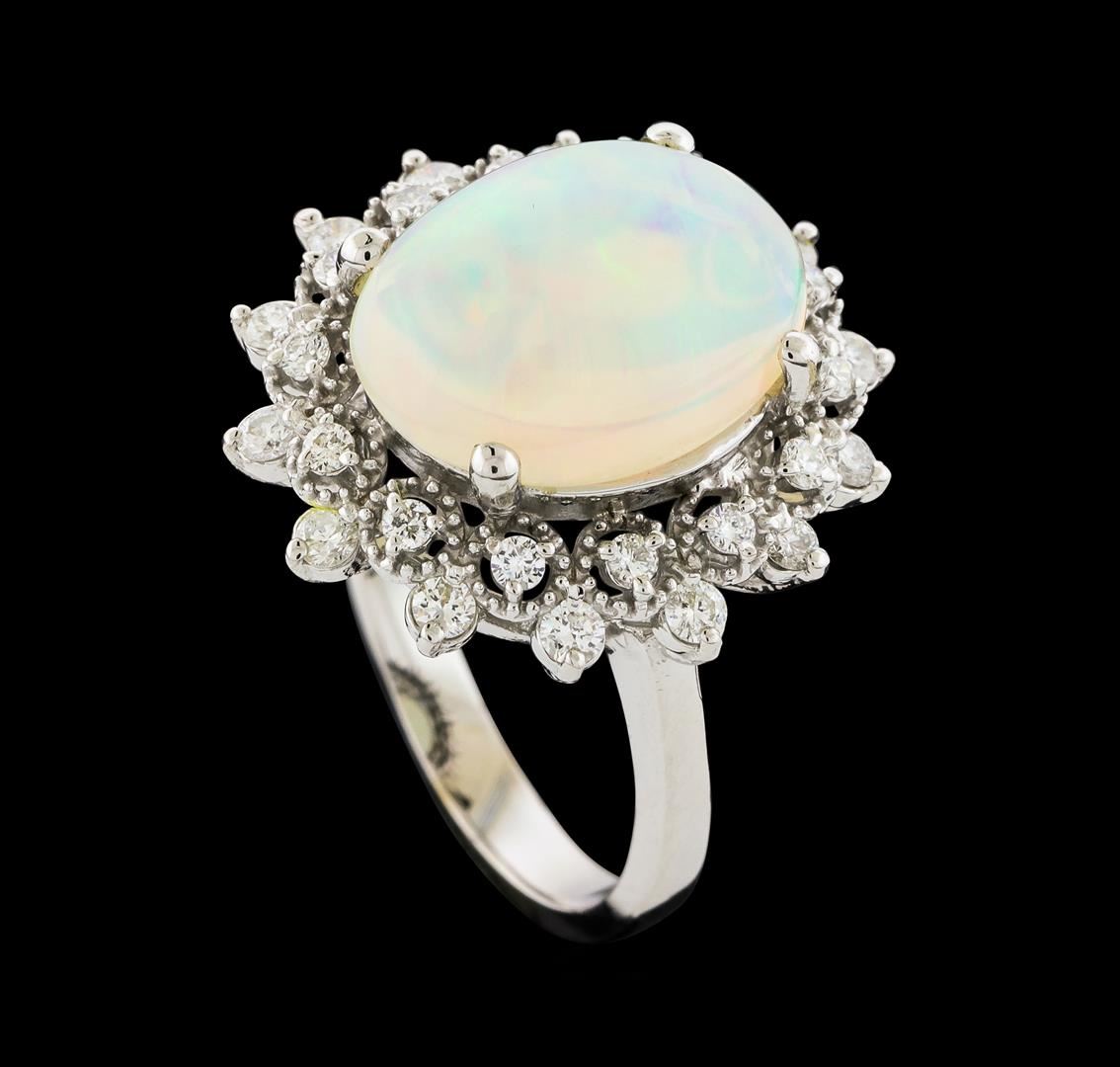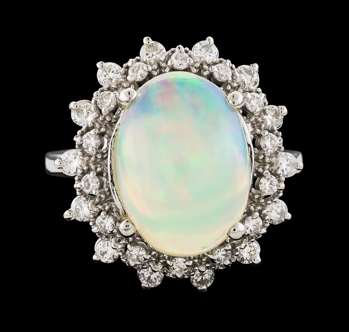 One Opal and Diamond Ring featuring: 14KT White Gold with a total weight of 5.11 grams, One Opal stone with a total weight of 3.20ct, and 28 Diamonds with a total weight of 0.55ctw.