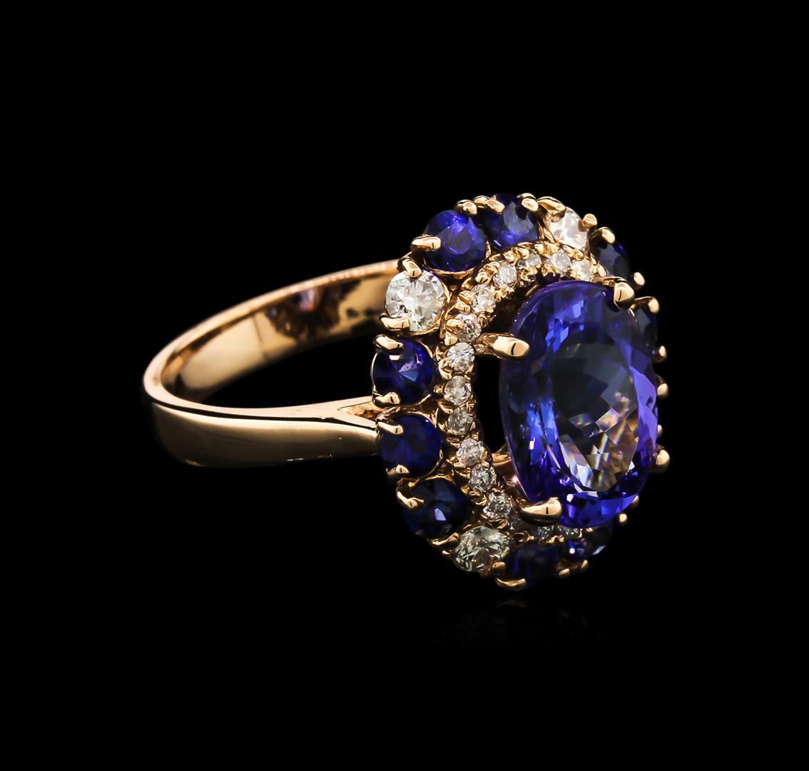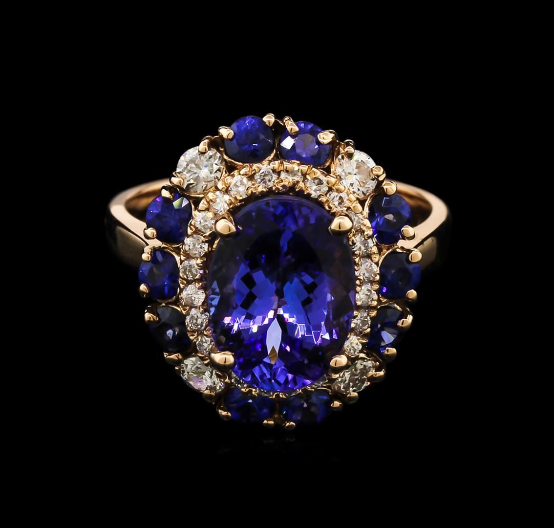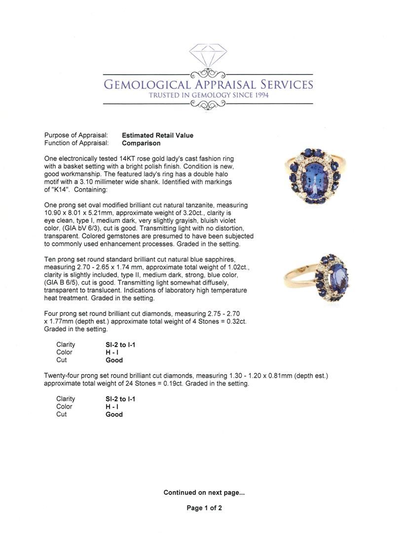 One electronically tested 14KT rose gold lady's cast fashion ring with a basket setting with a bright polish finish. The featured lady's ring has a double halo motif with a 3.10 millimeter wide shank. Identified with markings of "K14". Condition is new, good workmanship. Containing: One prong set oval modified brilliant cut natural tanzanite, measuring 10.90 x 8.01 x 5.21mm, approximate weight of 3.20ct., clarity is eye clean, type I, medium dark, very slightly grayish, bluish violet color, (GIA bV 6/3), cut is good. Transmitting light with no distortion, transparent. Colored gemstones are presumed to have been subjected to commonly used enhancement processes. Graded in the setting. Ten prong set round standard brilliant cut natural blue sapphires, measuring 2.70 - 2.65 x 1.74 mm, approximate total weight of 1.02ct., clarity is slightly included, type II, medium dark, strong, blue color, (GIA B 6/5), cut is good. Transmitting light somewhat diffusely, transparent to translucent. Indications of laboratory high temperature heat treatment. Graded in the setting. Four prong set round brilliant cut diamonds, measuring 2.75 - 2.70 x 1.77mm (depth est.) approximate total weight of 4 Stones = 0.32ct. Graded in the setting. Clarity: SI-2 to I-1. Color: H - I. Cut Good Twenty-Four prong set round brilliant cut diamonds, measuring 1.30 - 1.20 x 0.81mm (depth est.) approximate total weight of 24 Stones = 0.19ct. Graded in the setting. Clarity: SI-2 to I-1. Color: H - I. Cut Good. Total Weight of Colored Stones 4.22ct. Total Weight of Diamonds 0.51ct. Total Weight of Ring 5.60gm. GAS Appraised at $8,425.00.