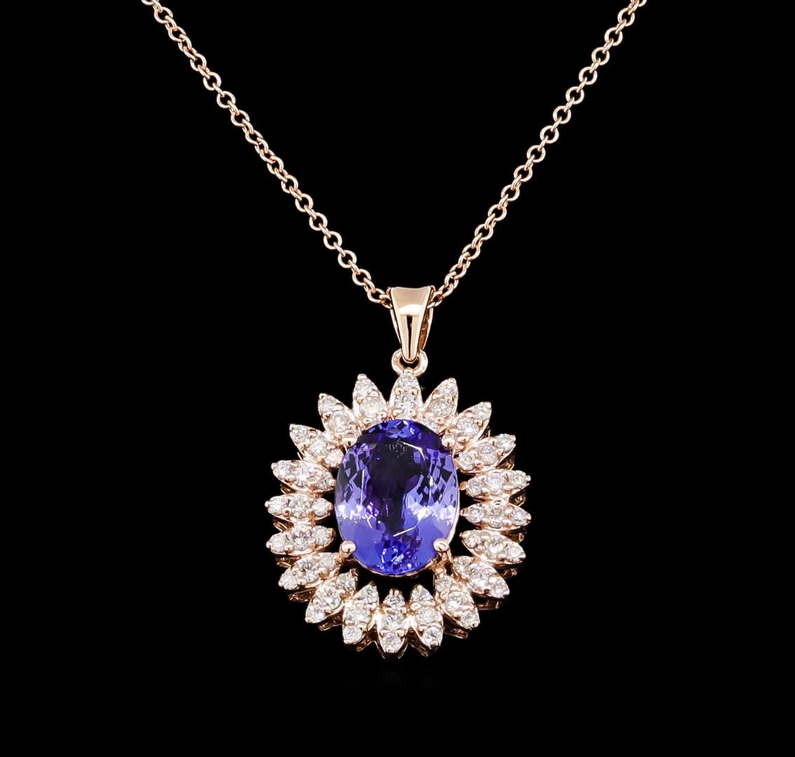 One electronically tested 14KT rose gold lady's combination cast & assembled fashion pendant and chain 18.0' long, 1.3mm round cable link with a lobster claw clasp with a bright polish finish. The featured lady's pendant and chain has a drop measuring 27 millimeters in length. Identified with markings of '14K'. Condition is new, good workmanship. Containing: One prong set oval modified brilliant cut natural tanzanite, measuring 10.80 x 8.13 x 4.80mm, (depth est.) 8%. bulge factor, approximate weight of 3.20ct., clarity is eye clean, medium light, moderately strong, violetish blue color, (GIA vB 4/4), cut is good. Transmitting light with no distortion, transparent. Colored gemstones are presumed to have been subjected to commonly used enhancement processes. Graded in the setting. Twenty prong set round brilliant cut diamonds, measuring 1.70 - 1.60 x 1.01mm (depth est.) approximate total weight of 20 Stones = 0.33ct. Graded in the setting. Clarity SI-1 to SI-2. Color: H - I Cut Good Forty prong set round brilliant cut diamonds, measuring 1.35 - 1.25 x 0.81mm (depth est.) approximate total weight of 40 Stones = 0.33ct. Graded in the setting. Clarity SI-1 to SI-2. Color: H - I Cut Good. Total Weight of Colored Stones 3.20ct.. Total Weight of Diamonds 0.66ct.. Total Weight of Pendant And Chain 5.80gm. GAS Appraised at $6,500.00.