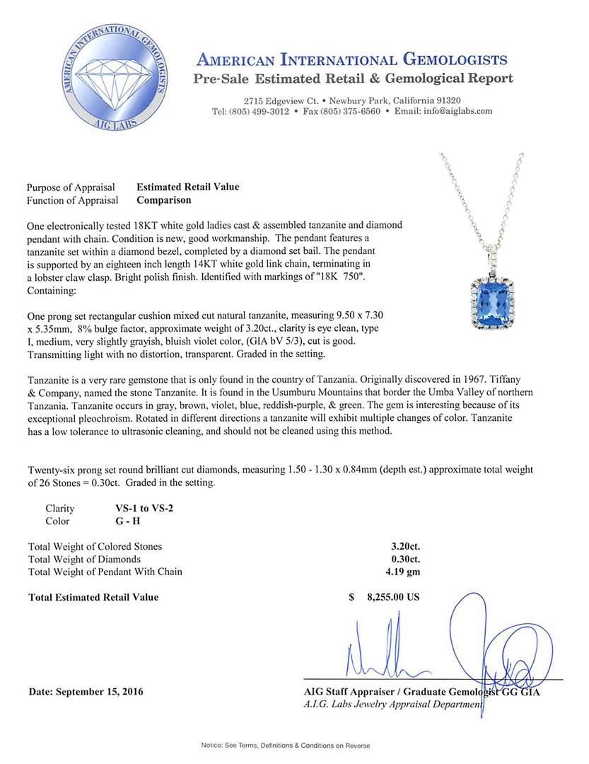 One electronically tested 18KT white gold ladies cast & assembled tanzanite and diamond pendant with chain. The pendant features a tanzanite set within a diamond bezel, completed by a diamond set bail. The pendant is supported by an eighteen inch length 14KT white gold link chain, terminating in a lobster claw clasp. Bright polish finish. Identified with markings of '18K 750'. Condition is new, good workmanship. Containing: One prong set rectangular cushion mixed cut natural tanzanite, measuring 9.50 x 7.30 x 5.35mm, 8%. bulge factor, approximate weight of 3.20ct., clarity is eye clean, type I, medium, very slightly grayish, bluish violet color, (GIA bV 5/3), cut is good. Transmitting light with no distortion, transparent. Graded in the setting. Tanzanite is a very rare gemstone that is only found in the country of Tanzania. Originally discovered in 1967. Tiffany & Company, named the stone Tanzanite. It is found in the Usumburu Mountains that border the Umba Valley of northern Tanzania. Tanzanite occurs in gray, brown, violet, blue, reddish-purple, & green. The gem is interesting because of its exceptional pleochroism. Rotated in different directions a tanzanite will exhibit multiple changes of color. Tanzanite has a low tolerance to ultrasonic cleaning, and should not be cleaned using this method. Twenty-Six prong set round brilliant cut diamonds, measuring 1.50 - 1.30 x 0.84mm (depth est.) approximate total weight of 26 Stones = 0.30ct. Graded in the setting. Clarity VS-1 to VS-2. Color: G - H. Total Weight of Colored Stones 3.20ct.. Total Weight of Diamonds 0.30ct.. Total Weight of Pendant With Chain 4.19gm. AIG Appraised at $8,255.00.