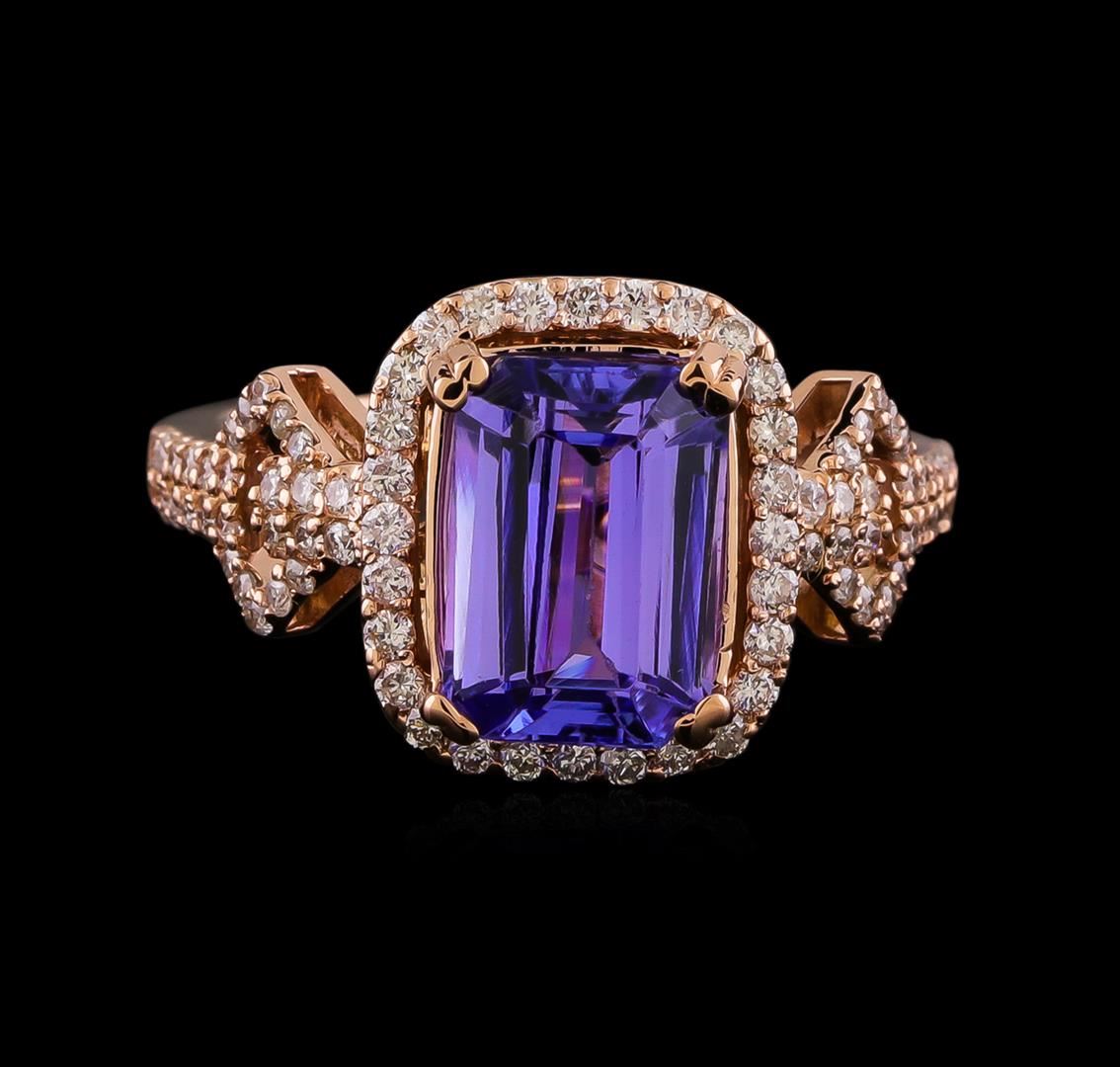 One ring featuring: 14KT rose gold weighing 5.11 grams containing one tanzanite with a total weight of 3.2ct and diamonds with a total weight of 0.50ctw.