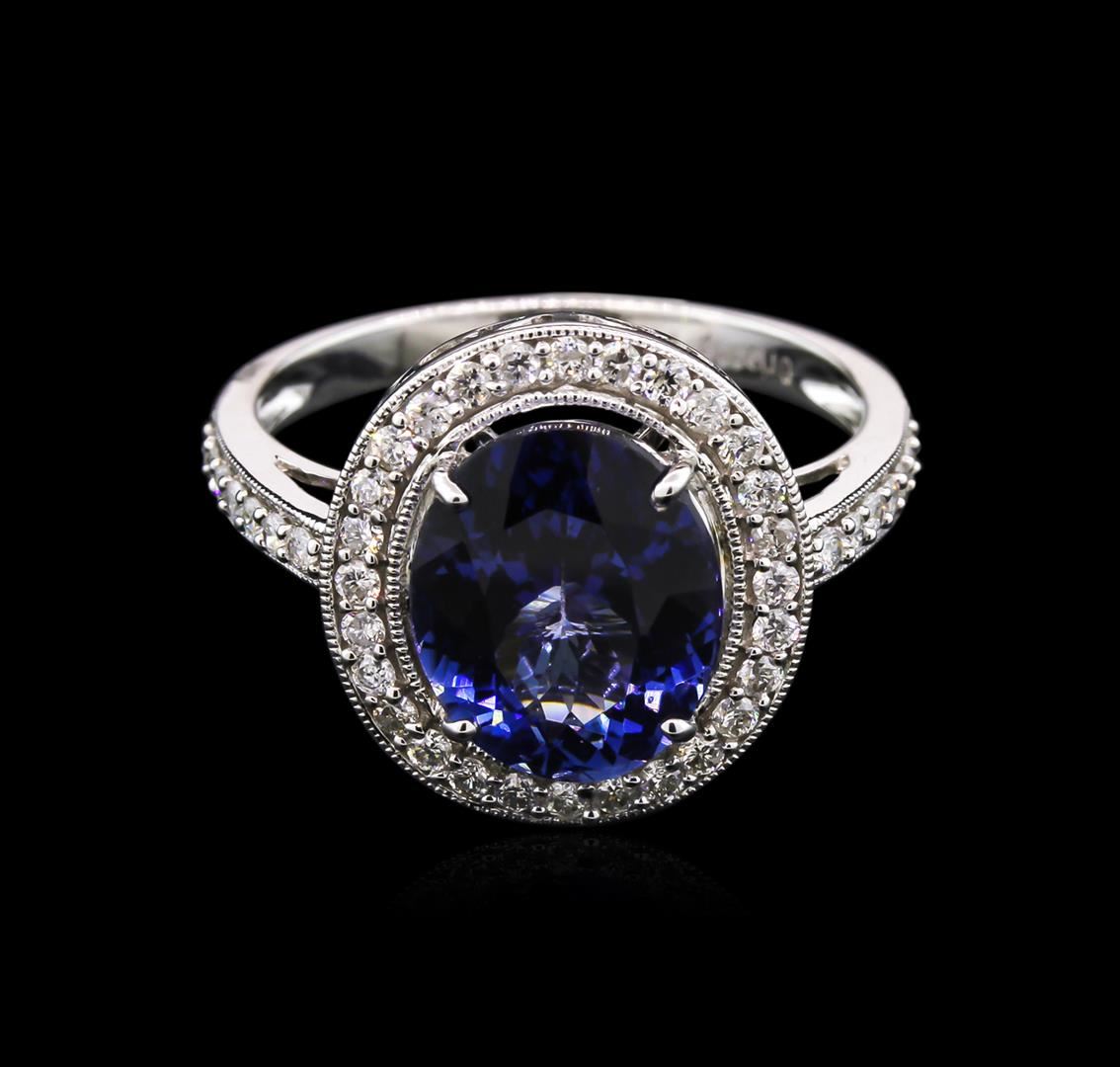 One electronically tested white gold ladies cast tanzanite and diamond ring. Condition is new, good workmanship. The featured tanzanite is set within a diamond bezel supported by diamond set shoulders, completed by a two and one-half millimeter wide band. Bright polish finish with milgrain detailing. Trademark is Orianne. Identified with markings of" 14K". Containing: One prong set oval mixed cut natural tanzanite, measuring 10.60 x 8.65 x 4.95mm, 5% bulge factor, approximate weight of 3.20ct., clarity is eye clean, type I, dark, very slightly grayish, violetish blue color, (GIA vB 7/3), cutis good. Natural Tanzanite, color enhanced due to cobalt coating. The presence of the coating prevents determining the stone's actual depth of color. Transmitting light with no distortion, transparent. Grading in the setting. The cobalt coated Tanzanite has a low tolerance to ultrasonic cleaning, and should not be cleaned using this method. Tanzanite is a very rare gemstone that is only found in the country of Tanzania. Originally discovered in 1967.Tiffany & Company, named the stone Tanzanite. It is found in the Usumbura Mountains that border the UmbaValley of northern Tanzania. Tanzanite occurs in gray, brown, violet, blue, reddish-purple, & green. The gem is interesting because of its exceptional pleochroism. Rotated in different directions a tanzanite will exhibit multiple changes of color. Forty-two prong set round brilliant cut diamonds, measuring 1.40 - 1.30 x 0.81mm (depth est.) approximate total weight of 42 Stones = 0.43ct. Graded in the setting. Clarity: SI-1 to I-1.Color: G - I. AIG Appraised at $3,780.00.