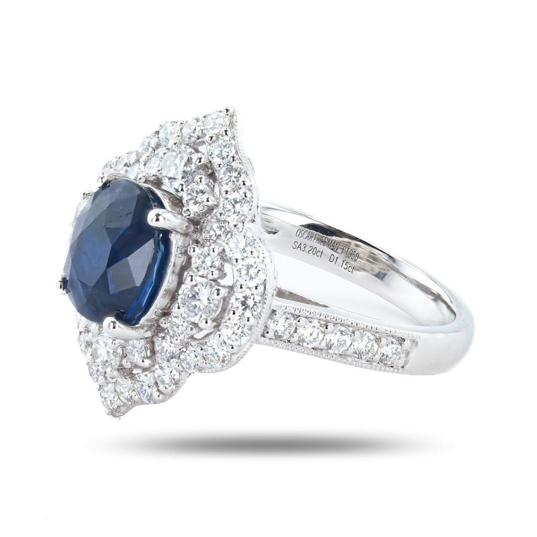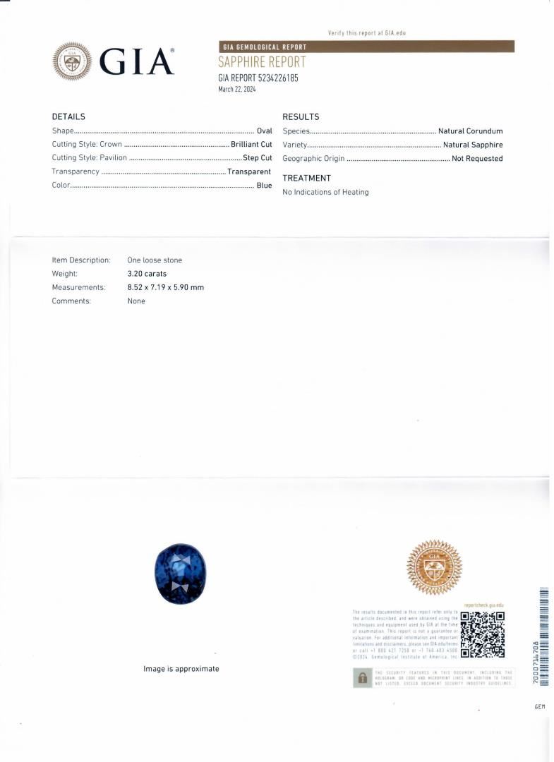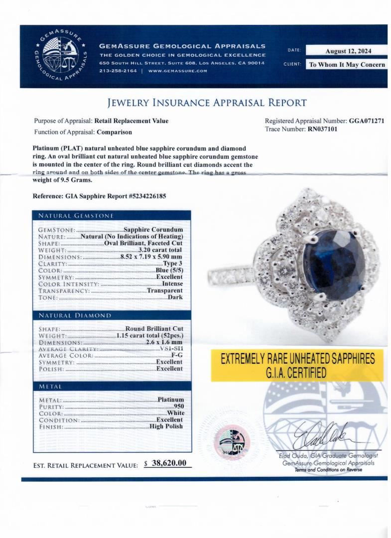 Platinum (PLAT) natural unheated blue sapphire corundum and diamond ring. An oval brilliant cut natural unheated blue sapphire corundum gemstone is mounted in the center of the ring. Round brilliant cut diamonds accent the ring around and on both sides of the center gemstone. The ring has a gross weight of 9.5 Grams. Reference: GIA Sapphire Report 5234226185 #NATURAL GEMSTONE# GEMSTONE: Sapphire Corundum NATURE: Natural (No Indications of Heating) SHAPE: Oval Brilliant, Faceted Cut WEIGHT: 3.20 carat total DIMENSIONS: 8.52 x 7.19 x 5.90mm CLARITY: Type 3 COLOR: Blue (5/5) SYMMETRY: Excellent COLOR INTENSITY: Intense TRANSPARENCY: Transparent TONE: Dark #NATURAL DIAMOND# SHAPE: Round Brilliant Cut WEIGHT: 1.15 carat total (52pcs.) DIMENSIONS: 2.6 x 1.6mm AVERAGE CLARITY: VS1-SI1 AVERAGE COLOR: F-G SYMMETRY: Excellent POLISH: Excellent #METAL# METAL: Platinum PURITY: 950 COLOR: White CONDITION: Excellent FINISH: High Polish Size: 6 3/4