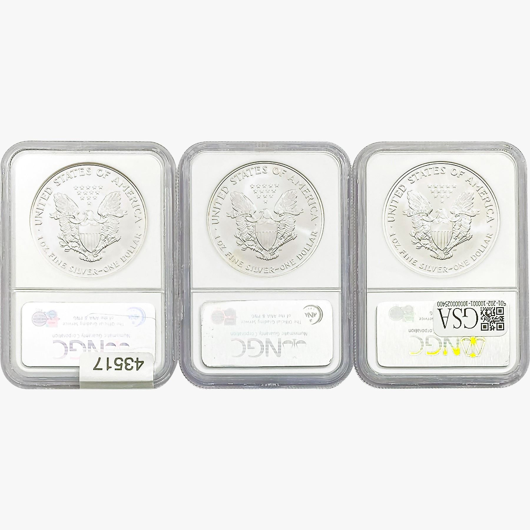 e. Coins sold referencing a third-party grading service are sold “AS IS” without any express or implied warranty, except for a guarantee by GSA that they are genuine. Removal or alteration of the holder, voids all of Bidder’s claims concerning that Product. Certain warranties may be available from the grading services and Bidders are referred to them for further details: Numismatic Guaranty Corporation (NGC), PO Box 4776, Sarasota, FL 34230, www.ngccoin.com/services/writtenguarantee.asp; Professional Coin Grading Services (PCGS), PO Box 9458, Newport Beach, CA 92658, www.pcgs.com/guarantee.html; ANACS, 6555 S. Kenton St., Ste. 303, Englewood, CO 80111; and Independent Coin Grading Co. (ICG), 7901 East Bellview, Ave., Suite 50, Englewood, CO 80111.