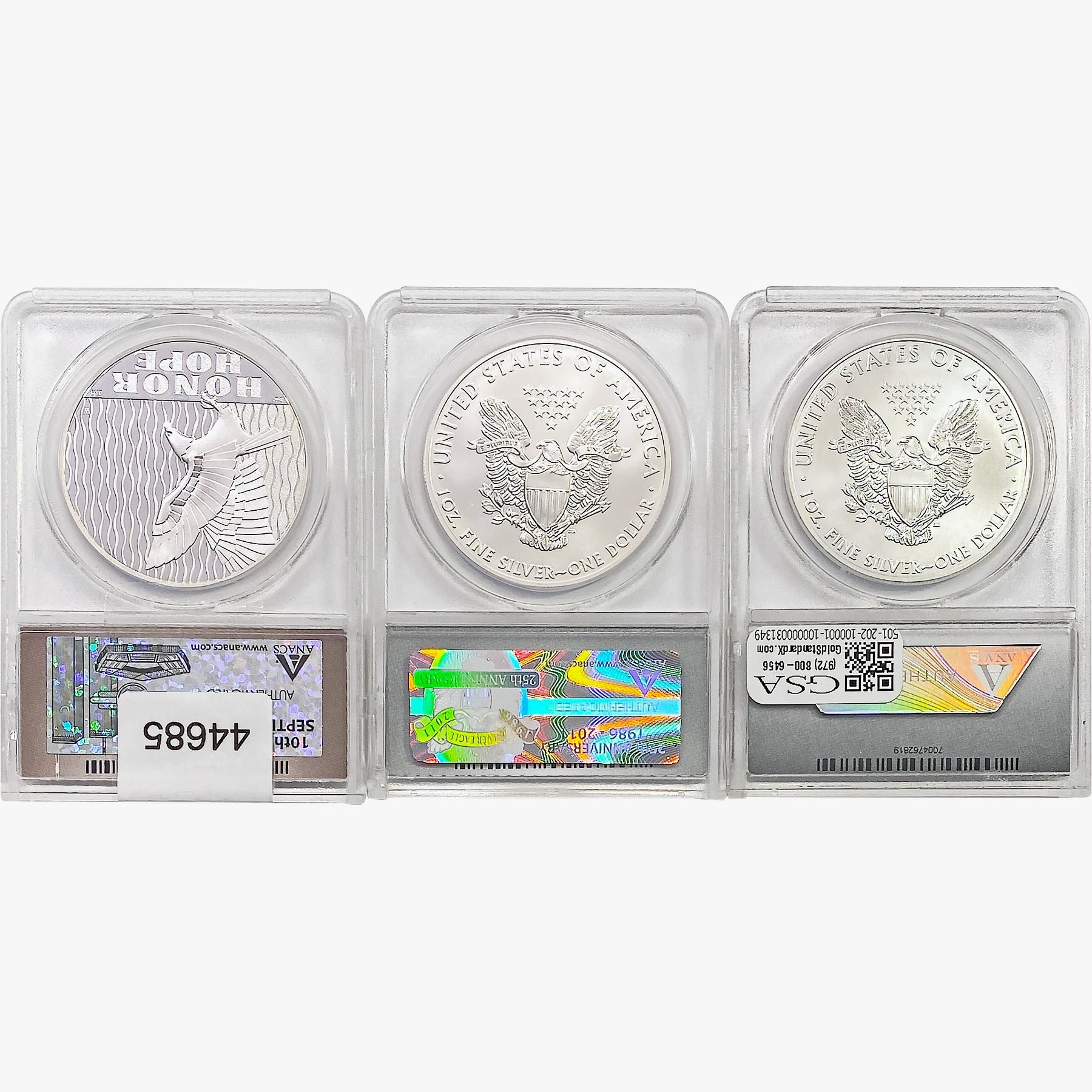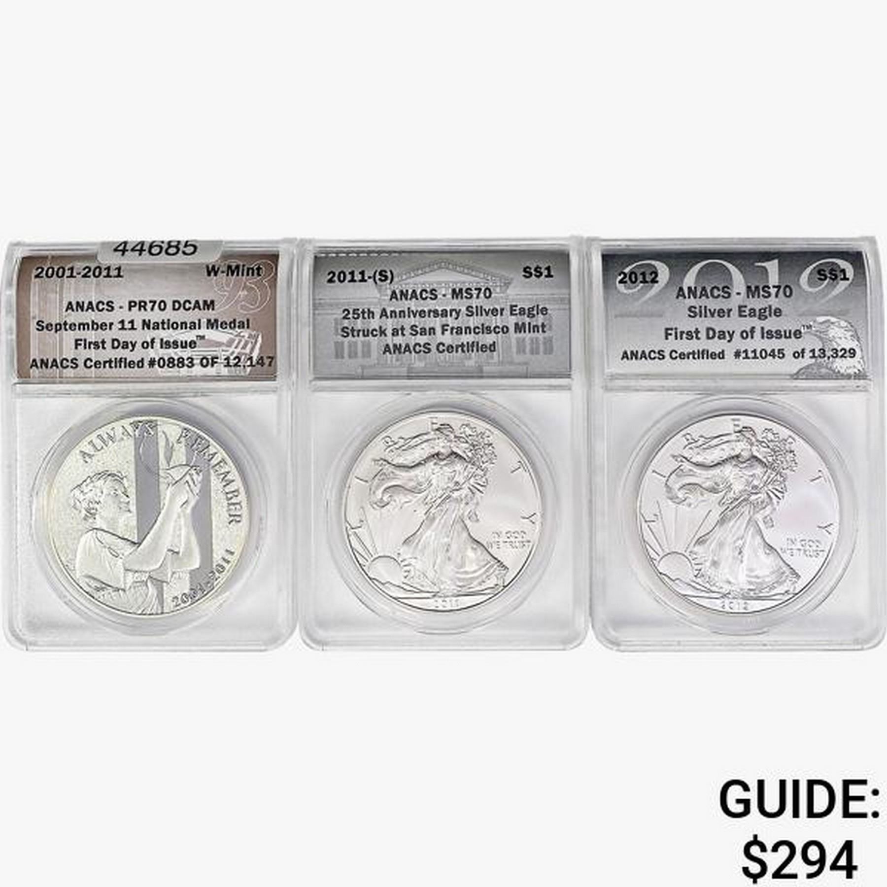 [3] 2001-2012 Various 1oz Silver Rounds ANACS MS/PR70 DCAM