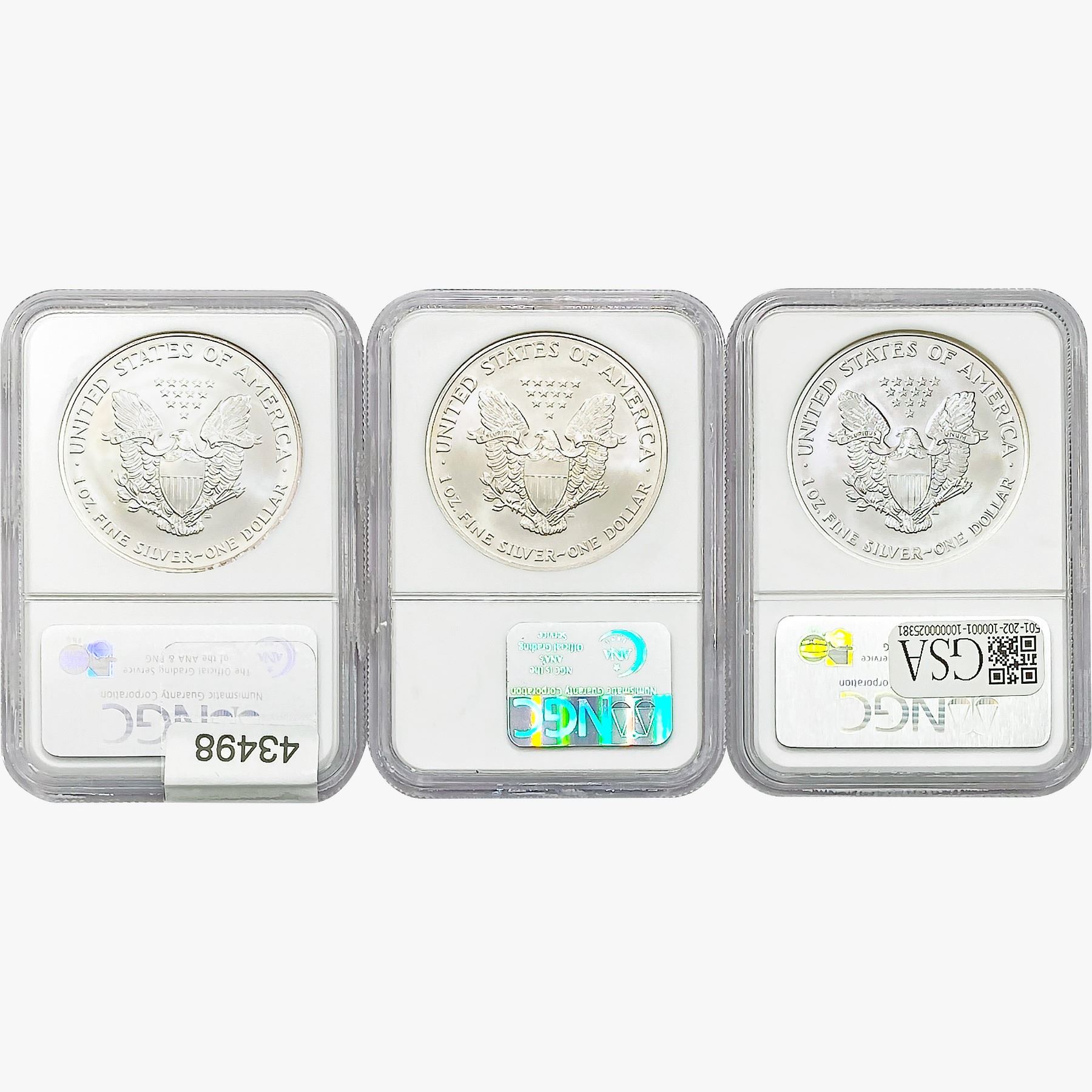 e. Coins sold referencing a third-party grading service are sold “AS IS” without any express or implied warranty, except for a guarantee by GSA that they are genuine. Removal or alteration of the holder, voids all of Bidder’s claims concerning that Product. Certain warranties may be available from the grading services and Bidders are referred to them for further details: Numismatic Guaranty Corporation (NGC), PO Box 4776, Sarasota, FL 34230, www.ngccoin.com/services/writtenguarantee.asp; Professional Coin Grading Services (PCGS), PO Box 9458, Newport Beach, CA 92658, www.pcgs.com/guarantee.html; ANACS, 6555 S. Kenton St., Ste. 303, Englewood, CO 80111; and Independent Coin Grading Co. (ICG), 7901 East Bellview, Ave., Suite 50, Englewood, CO 80111.