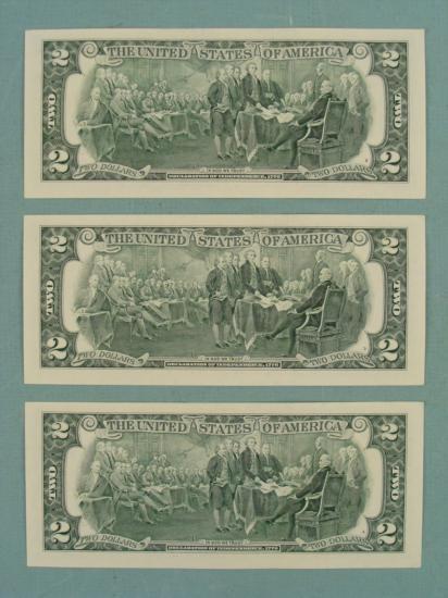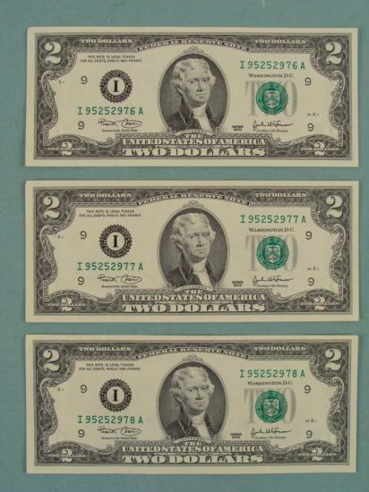 3) 2003 $2 Bills with consecutive serial numbers * * Mint mark: I (Minneapolis) * Condition: Crisp Uncirculated * * Serial number will be different from that shown
