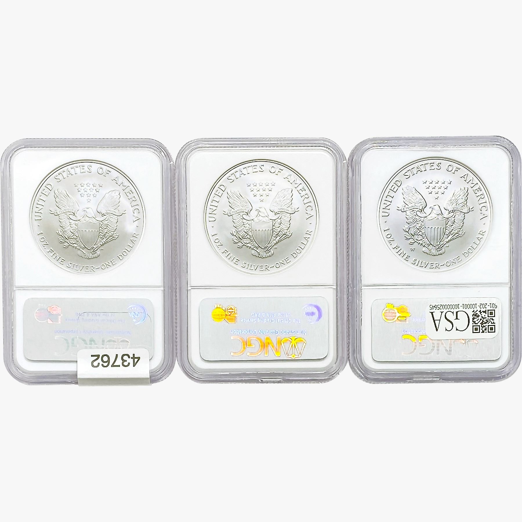 e. Coins sold referencing a third-party grading service are sold “AS IS” without any express or implied warranty, except for a guarantee by GSA that they are genuine. Removal or alteration of the holder, voids all of Bidder’s claims concerning that Product. Certain warranties may be available from the grading services and Bidders are referred to them for further details: Numismatic Guaranty Corporation (NGC), PO Box 4776, Sarasota, FL 34230, www.ngccoin.com/services/writtenguarantee.asp; Professional Coin Grading Services (PCGS), PO Box 9458, Newport Beach, CA 92658, www.pcgs.com/guarantee.html; ANACS, 6555 S. Kenton St., Ste. 303, Englewood, CO 80111; and Independent Coin Grading Co. (ICG), 7901 East Bellview, Ave., Suite 50, Englewood, CO 80111.