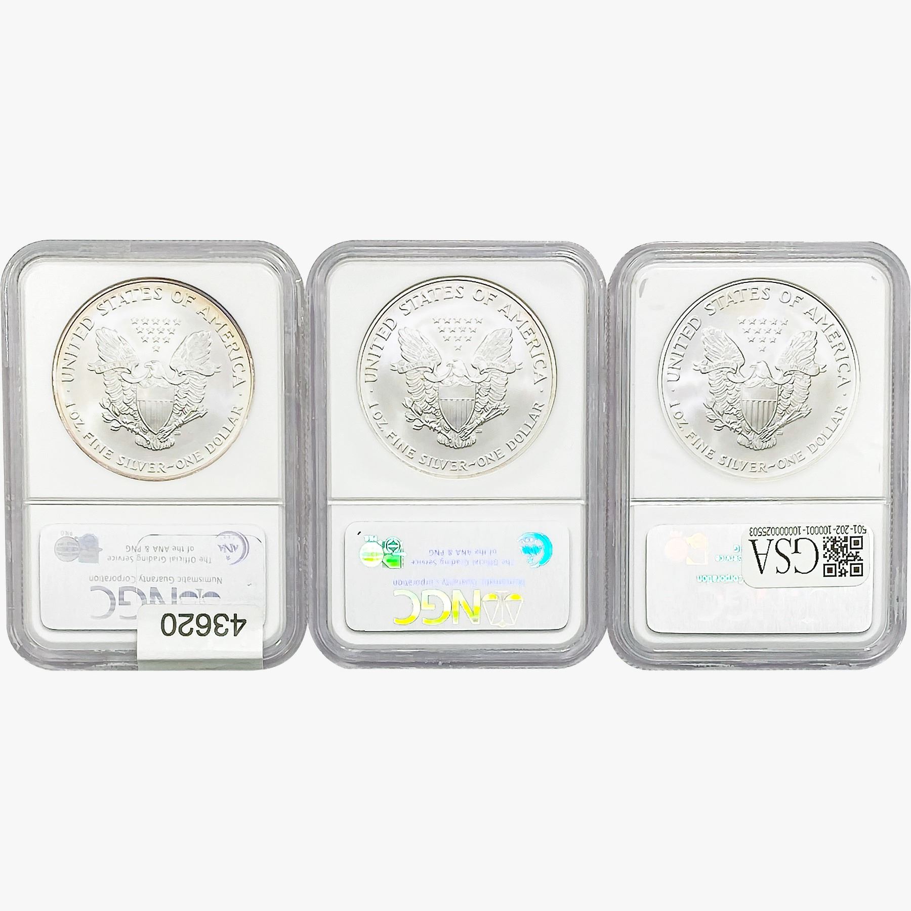 e. Coins sold referencing a third-party grading service are sold “AS IS” without any express or implied warranty, except for a guarantee by GSA that they are genuine. Removal or alteration of the holder, voids all of Bidder’s claims concerning that Product. Certain warranties may be available from the grading services and Bidders are referred to them for further details: Numismatic Guaranty Corporation (NGC), PO Box 4776, Sarasota, FL 34230, www.ngccoin.com/services/writtenguarantee.asp; Professional Coin Grading Services (PCGS), PO Box 9458, Newport Beach, CA 92658, www.pcgs.com/guarantee.html; ANACS, 6555 S. Kenton St., Ste. 303, Englewood, CO 80111; and Independent Coin Grading Co. (ICG), 7901 East Bellview, Ave., Suite 50, Englewood, CO 80111.