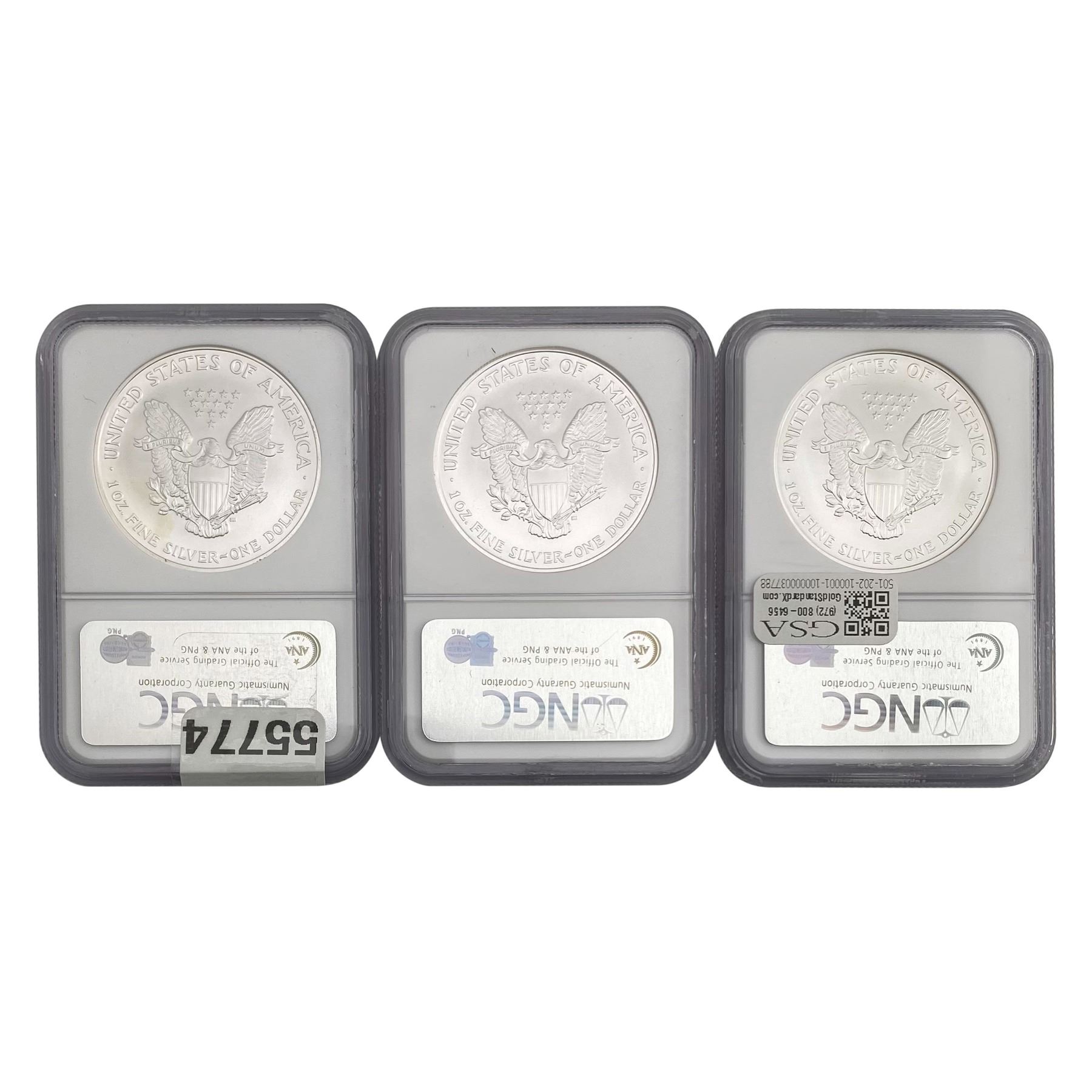 e. Coins sold referencing a third-party grading service are sold “AS IS” without any express or implied warranty, except for a guarantee by GSA that they are genuine. Removal or alteration of the holder, voids all of Bidder’s claims concerning that Product. Certain warranties may be available from the grading services and Bidders are referred to them for further details: Numismatic Guaranty Corporation (NGC), PO Box 4776, Sarasota, FL 34230, www.ngccoin.com/services/writtenguarantee.asp; Professional Coin Grading Services (PCGS), PO Box 9458, Newport Beach, CA 92658, www.pcgs.com/guarantee.html; ANACS, 6555 S. Kenton St., Ste. 303, Englewood, CO 80111; and Independent Coin Grading Co. (ICG), 7901 East Bellview, Ave., Suite 50, Englewood, CO 80111.
