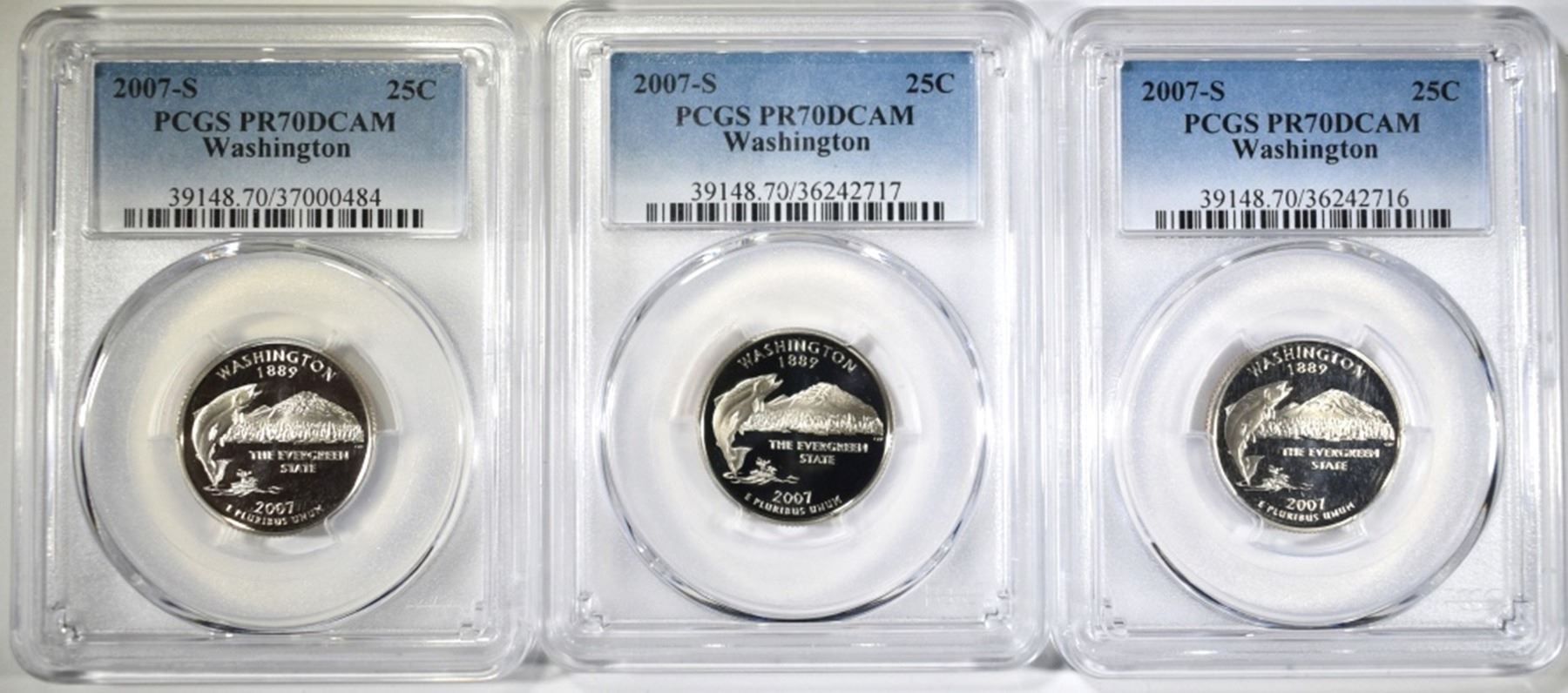 3 2007-S WA STATE QTRS, PCGS PF70 DCAM