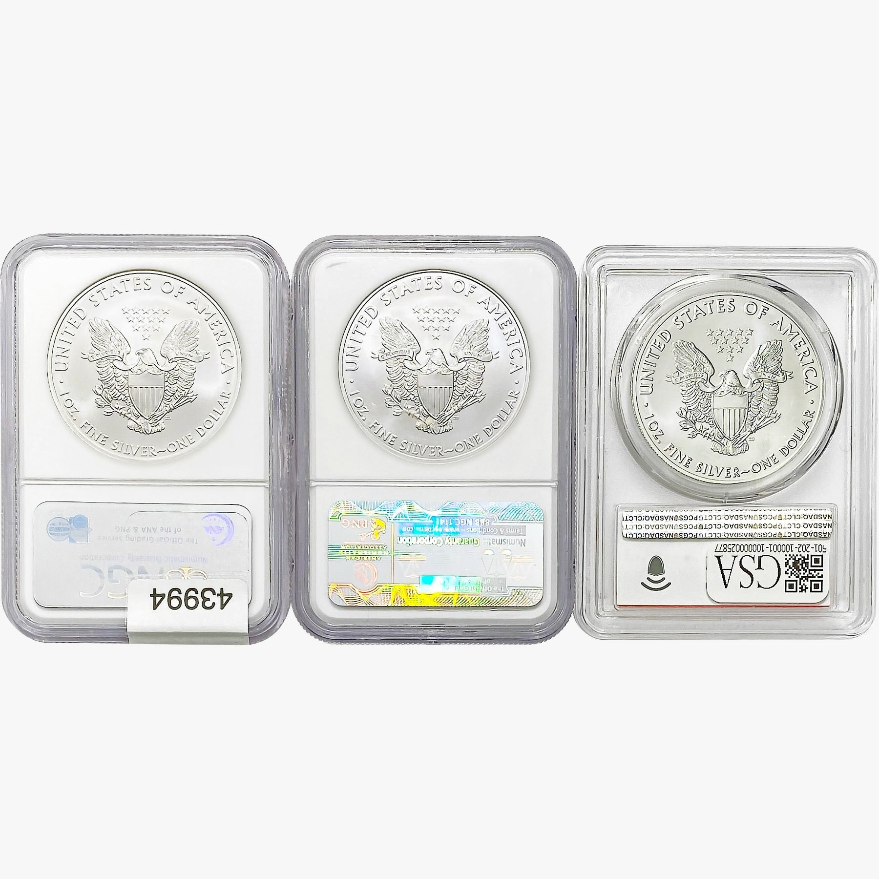e. Coins sold referencing a third-party grading service are sold “AS IS” without any express or implied warranty, except for a guarantee by GSA that they are genuine. Removal or alteration of the holder, voids all of Bidder’s claims concerning that Product. Certain warranties may be available from the grading services and Bidders are referred to them for further details: Numismatic Guaranty Corporation (NGC), PO Box 4776, Sarasota, FL 34230, www.ngccoin.com/services/writtenguarantee.asp; Professional Coin Grading Services (PCGS), PO Box 9458, Newport Beach, CA 92658, www.pcgs.com/guarantee.html; ANACS, 6555 S. Kenton St., Ste. 303, Englewood, CO 80111; and Independent Coin Grading Co. (ICG), 7901 East Bellview, Ave., Suite 50, Englewood, CO 80111.
