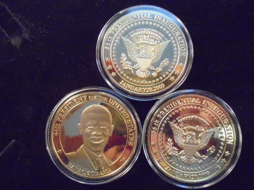 ALL THREE ARE GOLD IN COLOR AND ARE SILVER DOLLAR SIZED.