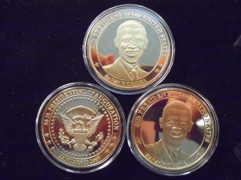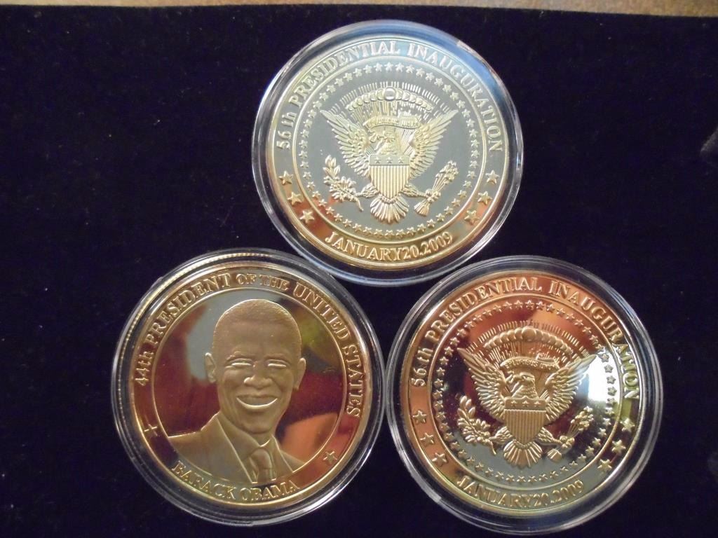 ALL THREE ARE GOLD IN COLOR AND ARE SILVER DOLLAR SIZED.