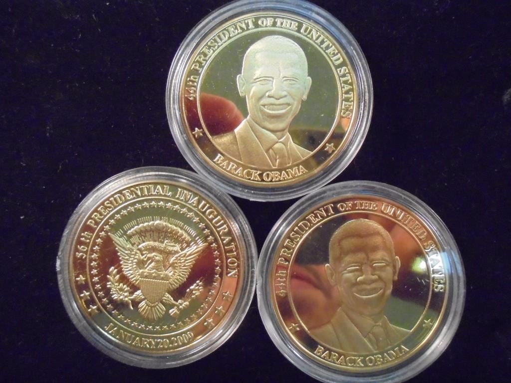 ALL THREE ARE GOLD IN COLOR AND ARE SILVER DOLLAR SIZED.