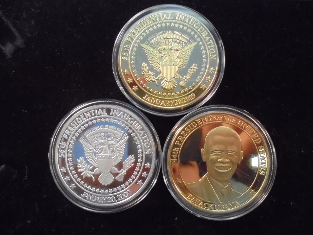 TWO ARE GOLD IN COLOR & 1 IS SILVER COLORED AND ARE SILVER DOLLAR SIZED.