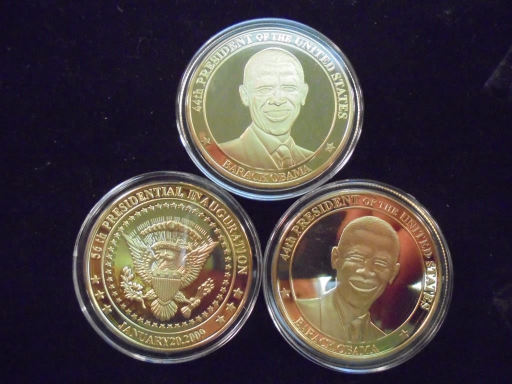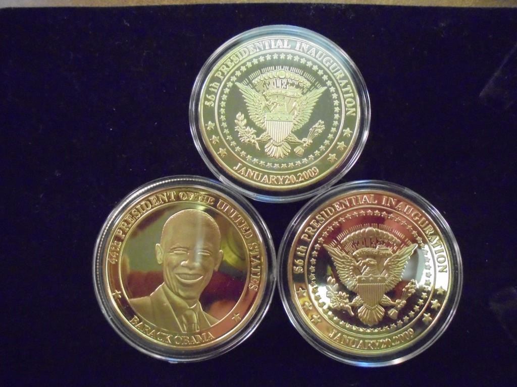 ALL THREE ARE GOLD IN COLOR AND ARE SILVER DOLLAR SIZED.