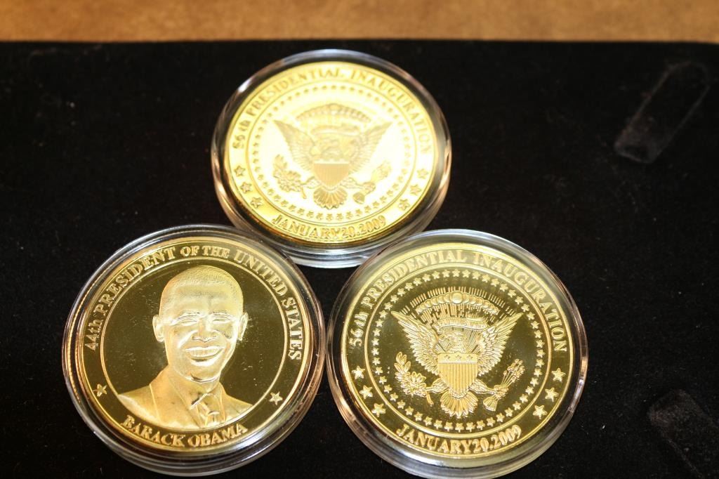 ALL THREE ARE GOLD IN COLOR AND ARE SILVER DOLLAR SIZED.