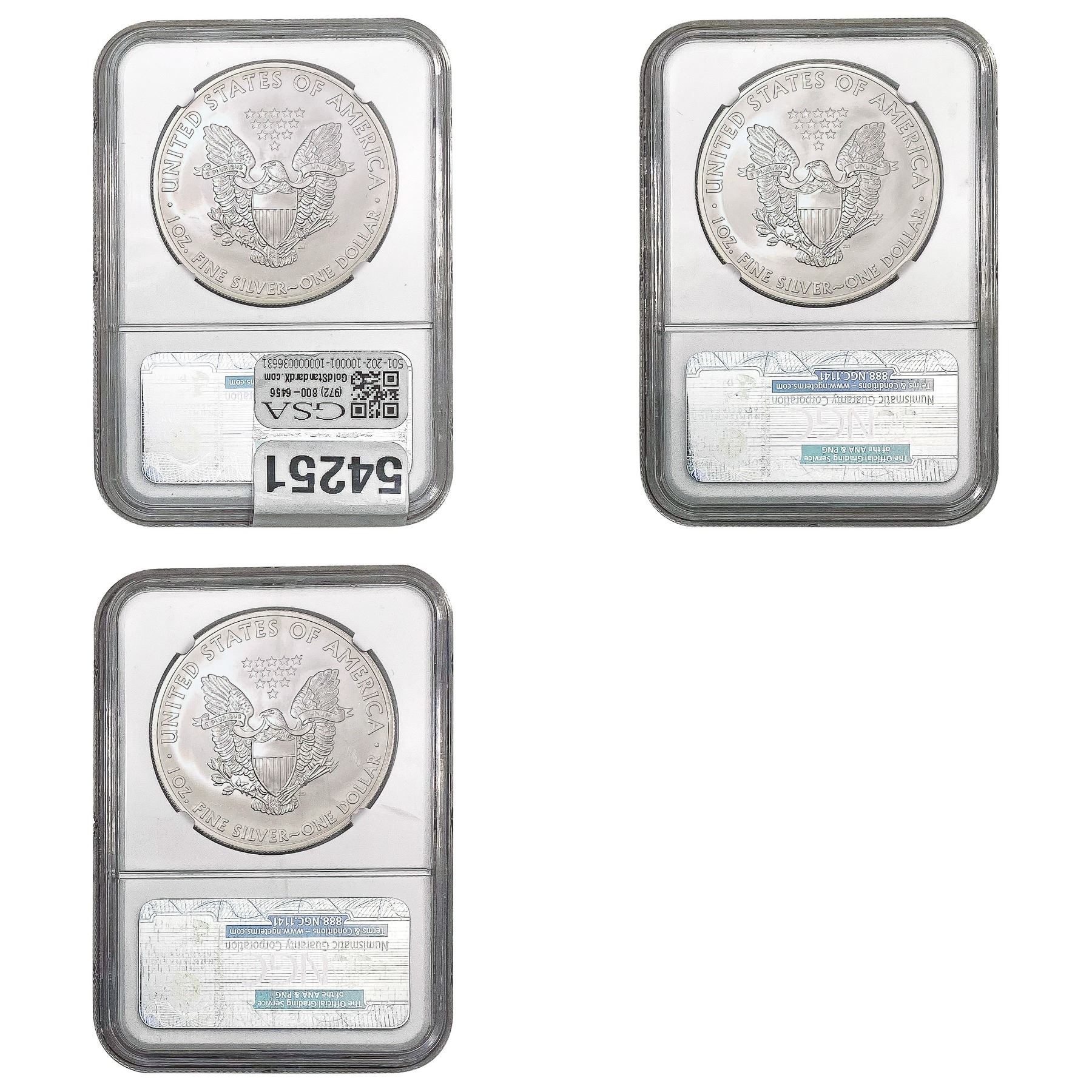 e. Coins sold referencing a third-party grading service are sold “AS IS” without any express or implied warranty, except for a guarantee by GSA that they are genuine. Removal or alteration of the holder, voids all of Bidder’s claims concerning that Product. Certain warranties may be available from the grading services and Bidders are referred to them for further details: Numismatic Guaranty Corporation (NGC), PO Box 4776, Sarasota, FL 34230, www.ngccoin.com/services/writtenguarantee.asp; Professional Coin Grading Services (PCGS), PO Box 9458, Newport Beach, CA 92658, www.pcgs.com/guarantee.html; ANACS, 6555 S. Kenton St., Ste. 303, Englewood, CO 80111; and Independent Coin Grading Co. (ICG), 7901 East Bellview, Ave., Suite 50, Englewood, CO 80111.