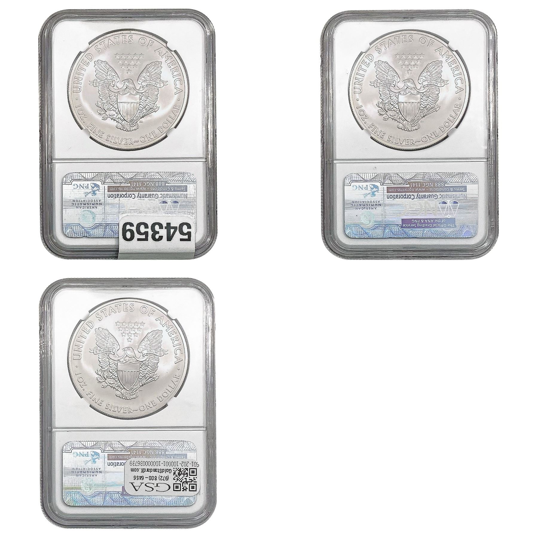 e. Coins sold referencing a third-party grading service are sold “AS IS” without any express or implied warranty, except for a guarantee by GSA that they are genuine. Removal or alteration of the holder, voids all of Bidder’s claims concerning that Product. Certain warranties may be available from the grading services and Bidders are referred to them for further details: Numismatic Guaranty Corporation (NGC), PO Box 4776, Sarasota, FL 34230, www.ngccoin.com/services/writtenguarantee.asp; Professional Coin Grading Services (PCGS), PO Box 9458, Newport Beach, CA 92658, www.pcgs.com/guarantee.html; ANACS, 6555 S. Kenton St., Ste. 303, Englewood, CO 80111; and Independent Coin Grading Co. (ICG), 7901 East Bellview, Ave., Suite 50, Englewood, CO 80111.