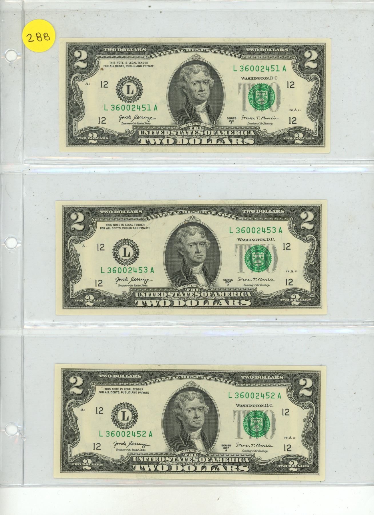 (3) 2017 U.S.A Two Dollars in Sequence.