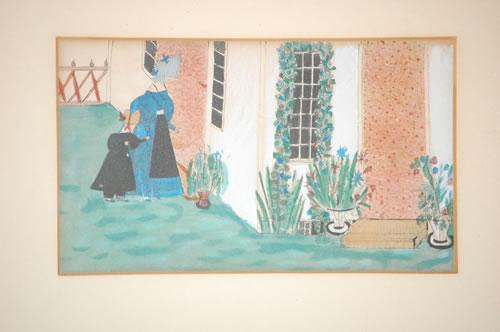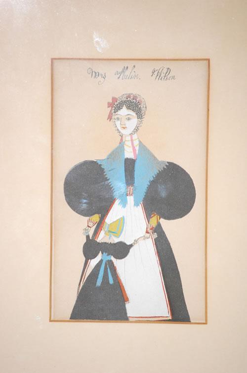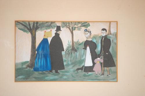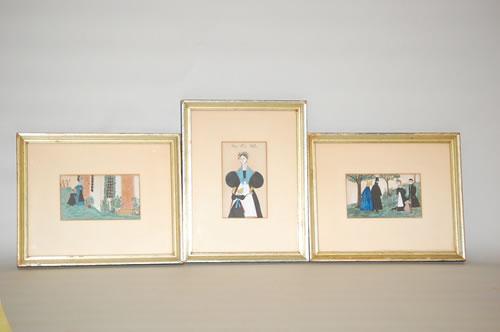 (3) 20TH CENT. FOLK ART WATERCOLOR PAINTINGS - (3) 19TH CENT. STYLE FOLKY WATERCOLOR & GOUACHE PAINTINGS INCL. WOMEN & GIRLS IN BONNETS & APRONS, MEN IN FROCK COATS & TOP HAT-UNSIGNED, MATTED & GILT FRAMED (3 1/2" X 5 3/4") - FRAME WEAR, MINOR TONING
