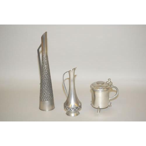 (3) 20TH CENT. WHITE METAL PITCHERS - 11 1/2" PEWTER<BR>OSLO METAL NORWAY EWER MARKED PERLETINN 069 ETC.,<BR>7" NORWAY PITCHER EWER & 4 1/2" SPUN ALUMINUM COVERED<BR>TANKARD W/ LION FEET & HANDLE-ALL W/ CHASED ENGRAVED<BR>OR MOLDED DECORATIONS-WEAR, IMPERFECTIONS