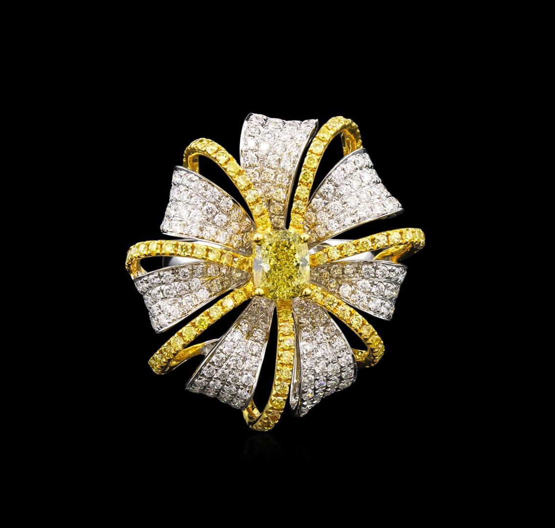 One electronically tested 18KT white and yellow gold lady's combination cast & assembled fashion ring with a bright polish finish. The featured lady's ring has a ribbon-esque bow motif with a shank measuring 4.12 millimeters wide. Trademark is CJ. Identified with markings of "18K". Condition is new, good workmanship. Containing: One prong set cushion cut diamond(depth est.) approximate weight of 1.07ct. Graded in the setting. Clarity: SI-2 Cut Very Good Seventy-Eight prong set round brilliant cut diamonds, measuring 1.30 - 1.25 x 0.83mm (depth est.) approximate total weight of 78 Stones = 0.65ct. Colored gemstones are presumed to have been subjected to commonly used enhancement processes. Graded in the setting. Clarity: VS-2 to SI-1 Cut Good One Hundred Ninety-Six bead set round brilliant cut diamonds, measuring 1.30 - 1.25 x 0.77mm (depth est.) approximate total weight of 196 Stones = 1.48ct. Graded in the setting. Clarity: VS-2 to SI-2. Color: G - H. Cut Good. Total Weight of Diamonds 3.20ct. Total Weight of Ring 14.60gm. GAS Appraised at $22,295.00.