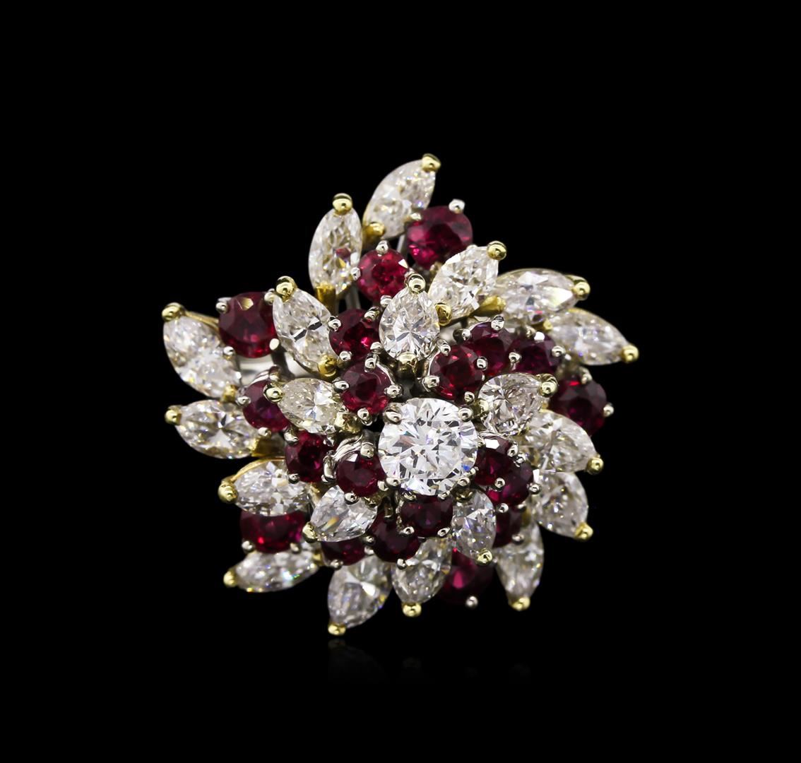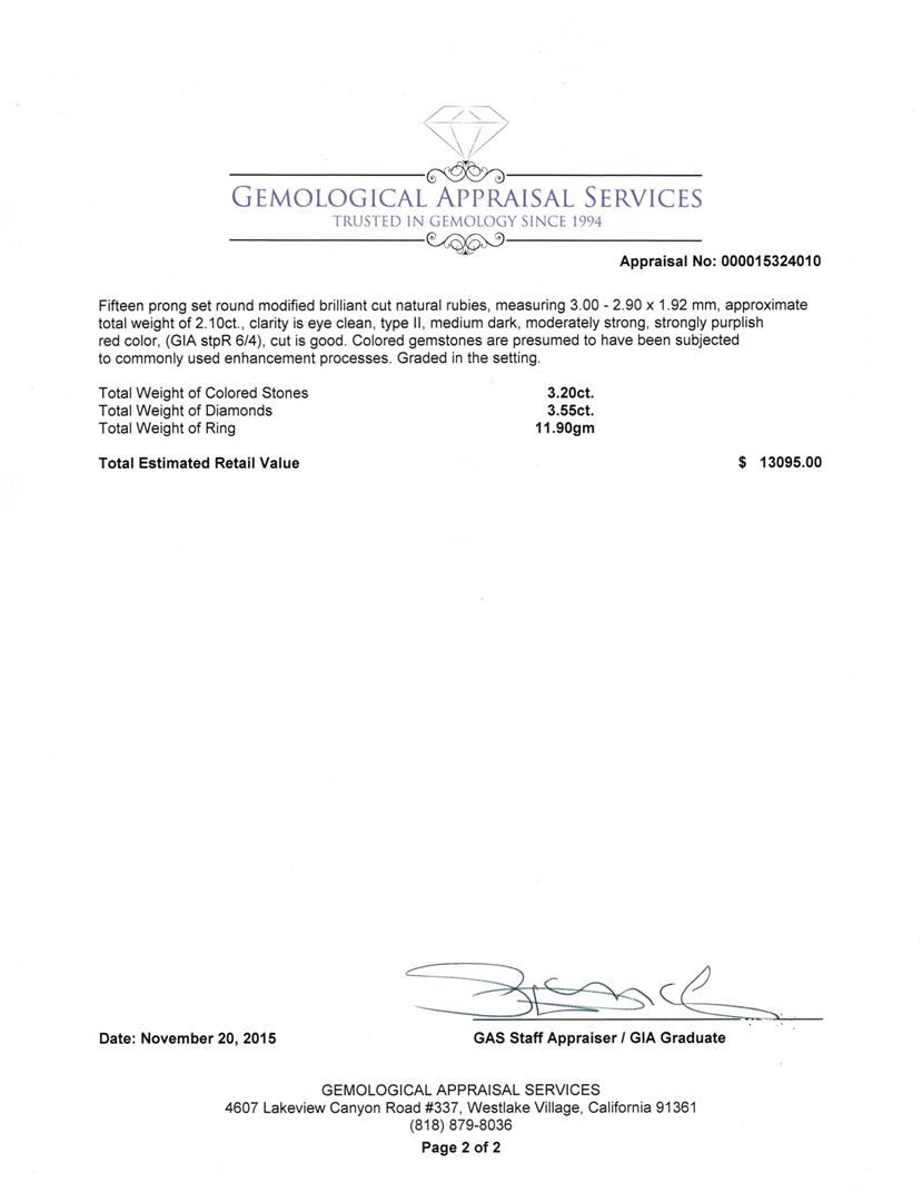One electronically tested 14KT white and yellow gold lady's hand fabricated fashion ring with a bright polish finish. The featured lady's ring has a towered star swirl motif and a shank measuring 2.70 millimeters wide. Identified with markings of "14K". Condition is used, good workmanship. Containing: One prong set round brilliant cut diamond, measuring 5.15 - 5.11 x 3.33mm (depth est.) approximate weight of 0.55ct. Graded in the setting. Clarity: VS-2. Color: G. Cut Good Fifteen prong set marquise shaped cut diamonds, measuring 4.70 x 3.00 x 1.89mm (depth est.) approximate total weight of 15 Stones = 2.30ct. Graded in the setting. Clarity: VS-2 to SI-2. Color: H - I. Cut Good Five prong set pear shaped cut diamonds, measuring 4.00 x 3.00 x 1.89mm (depth est.) approximate total weight of 5 Stones = 0.70ct. Graded in the setting. Clarity: SI-1 to SI-2. Color: H - I. Cut Good Five prong set round modified brilliant cut natural rubies, measuring 3.50 - 3.40 x 2.24 mm, approximate total weight of 1.10ct., clarity is eye clean, type II, medium dark, moderately strong, strongly purplish red color, (GIA stpR 6/4), cut is good. Colored gemstones are presumed to have been subjected to commonly used enhancement processes. Graded in the setting. Fifteen prong set round modified brilliant cut natural rubies, measuring 3.00 - 2.90 x 1.92 mm, approximate total weight of 2.10ct., clarity is eye clean, type II, medium dark, moderately strong, strongly purplish red color, (GIA stpR 6/4), cut is good. Colored gemstones are presumed to have been subjected to commonly used enhancement processes. Graded in the setting. Total Weight of Colored Stones 3.20ct. Total Weight of Diamonds 3.55ct. Total Weight of Ring 11.90gm. GAS Appraised at $13,095.00.