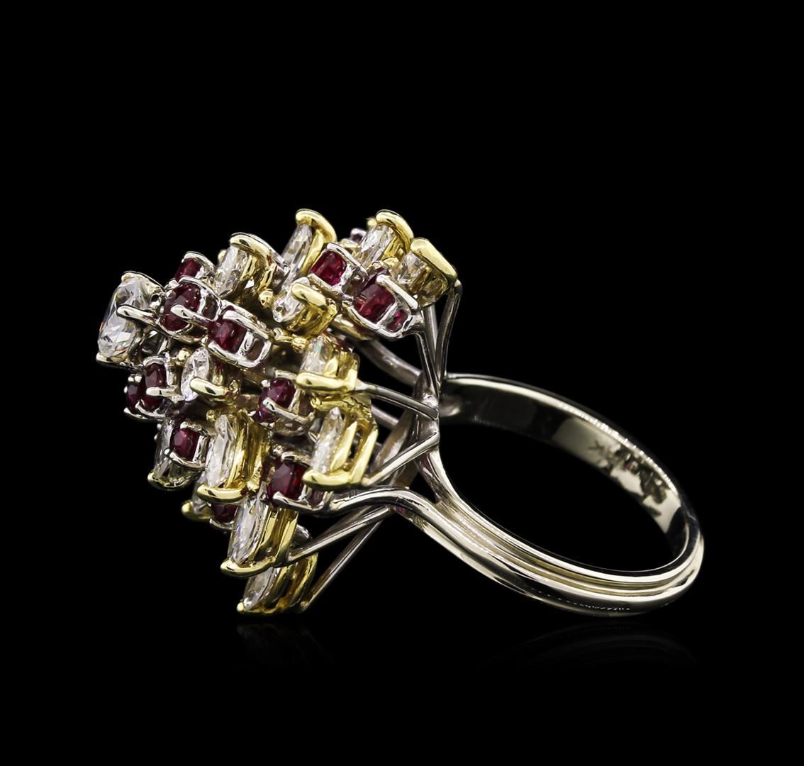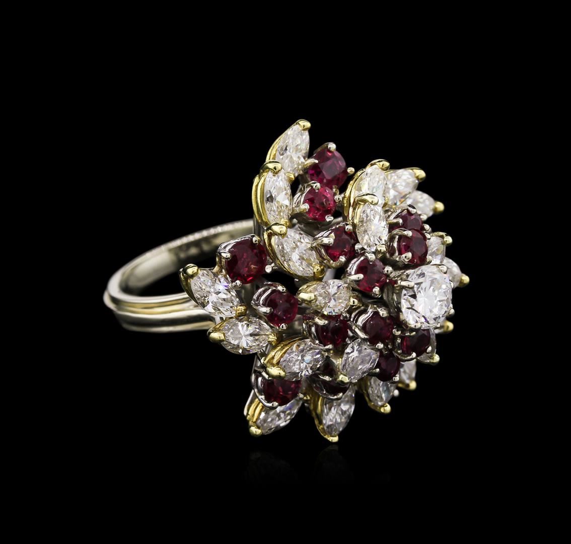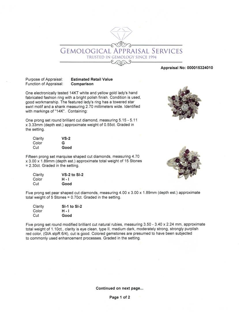 One electronically tested 14KT white and yellow gold lady's hand fabricated fashion ring with a bright polish finish. The featured lady's ring has a towered star swirl motif and a shank measuring 2.70 millimeters wide. Identified with markings of "14K". Condition is used, good workmanship. Containing: One prong set round brilliant cut diamond, measuring 5.15 - 5.11 x 3.33mm (depth est.) approximate weight of 0.55ct. Graded in the setting. Clarity: VS-2. Color: G. Cut Good Fifteen prong set marquise shaped cut diamonds, measuring 4.70 x 3.00 x 1.89mm (depth est.) approximate total weight of 15 Stones = 2.30ct. Graded in the setting. Clarity: VS-2 to SI-2. Color: H - I. Cut Good Five prong set pear shaped cut diamonds, measuring 4.00 x 3.00 x 1.89mm (depth est.) approximate total weight of 5 Stones = 0.70ct. Graded in the setting. Clarity: SI-1 to SI-2. Color: H - I. Cut Good Five prong set round modified brilliant cut natural rubies, measuring 3.50 - 3.40 x 2.24 mm, approximate total weight of 1.10ct., clarity is eye clean, type II, medium dark, moderately strong, strongly purplish red color, (GIA stpR 6/4), cut is good. Colored gemstones are presumed to have been subjected to commonly used enhancement processes. Graded in the setting. Fifteen prong set round modified brilliant cut natural rubies, measuring 3.00 - 2.90 x 1.92 mm, approximate total weight of 2.10ct., clarity is eye clean, type II, medium dark, moderately strong, strongly purplish red color, (GIA stpR 6/4), cut is good. Colored gemstones are presumed to have been subjected to commonly used enhancement processes. Graded in the setting. Total Weight of Colored Stones 3.20ct. Total Weight of Diamonds 3.55ct. Total Weight of Ring 11.90gm. GAS Appraised at $13,095.00.