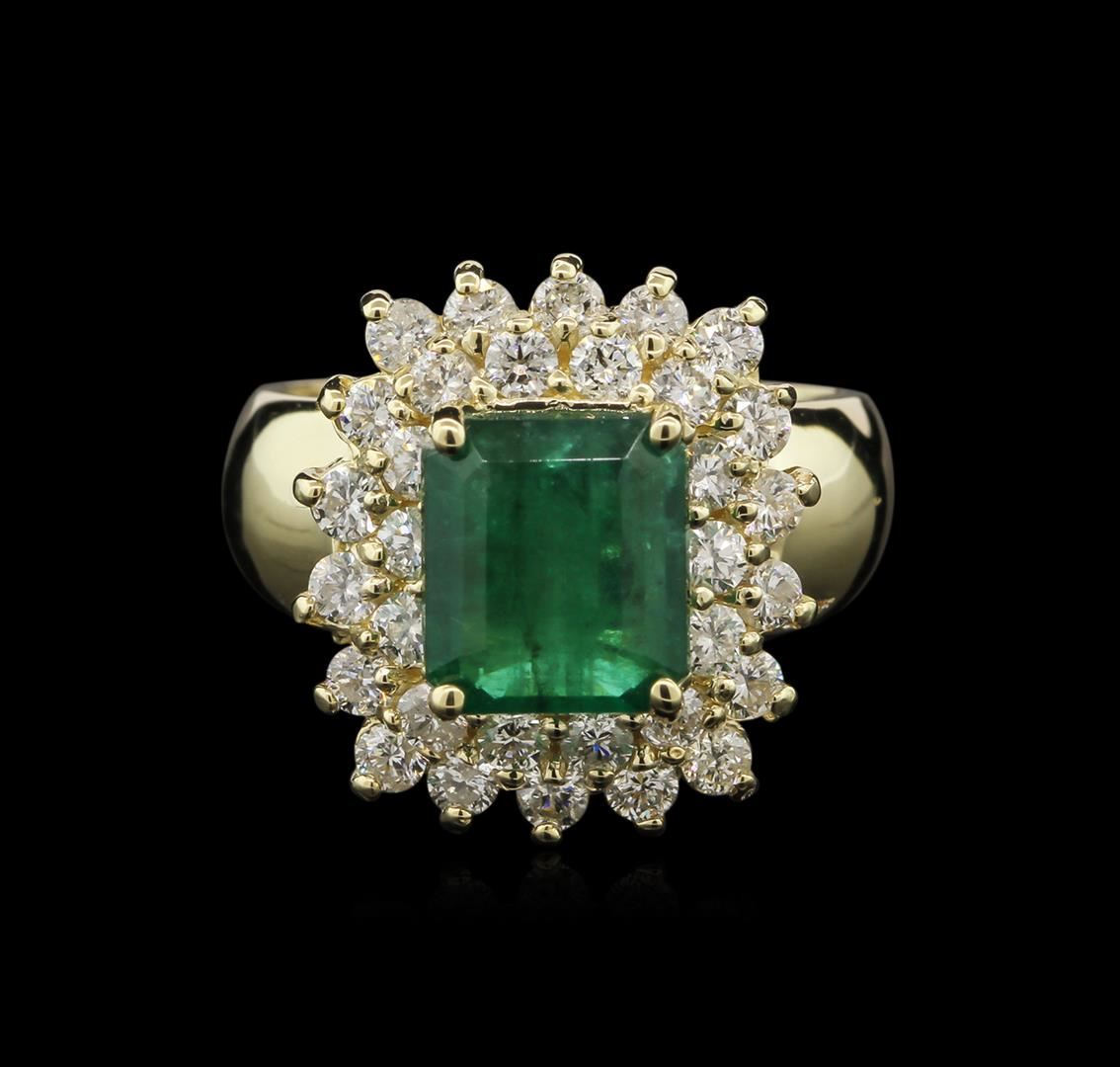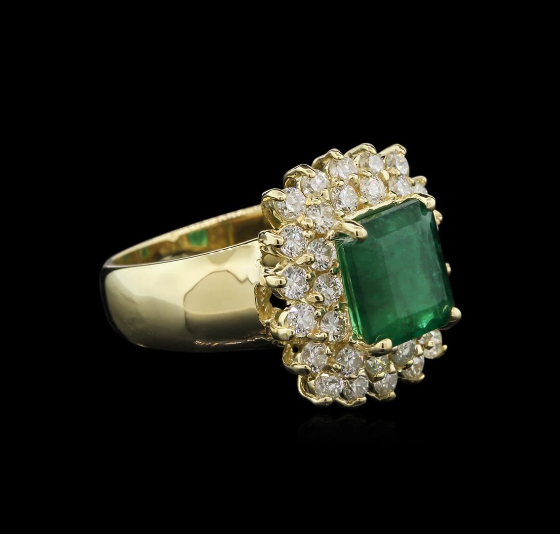 One electronically tested 14KT yellow gold ladies cast emerald and diamond ring with a bright polish finish. The featured emerald is set within tiered diamond bezels, completed by a four millimeter wide band. Condition is new, good workmanship. Containing: One prong set rectangular step cut natural emerald exact weight 3.21ct., clarity is heavily included, type III, medium dark, very slightly grayish, very slightly bluish green color, (GIA vslbG 6/3), cut is good. Transmitting light somewhat diffusely, translucent. Naturally occurring internal & external characteristics are present. Indications of oil residue. Graded in the setting. Thirty-Two prong set round brilliant cut diamonds exact total weight 32 Stones = 1.50ct. Graded in the setting. Clarity: SI-2 to I-1. Color: G - I. Total Weight of Colored Stones 3.21ct. Total Weight of Diamonds 1.50ct. Total Weight of Ring 9.65gm. AIG Appraised at $8,610.00.