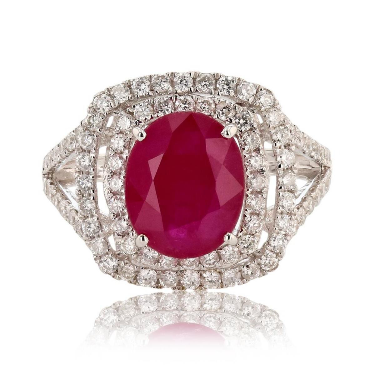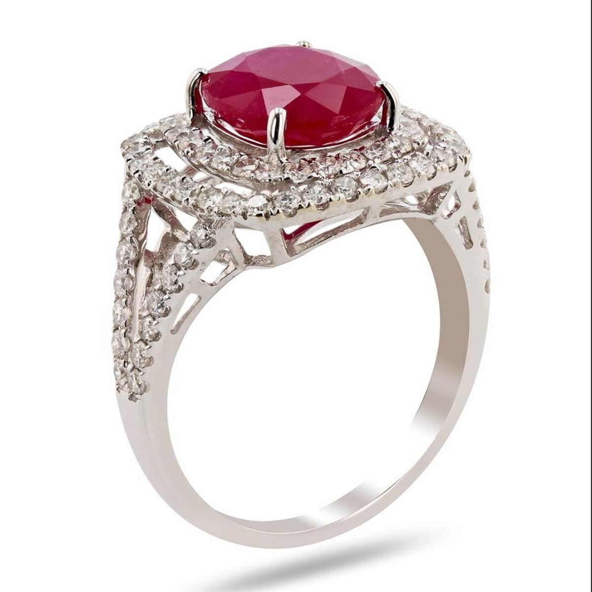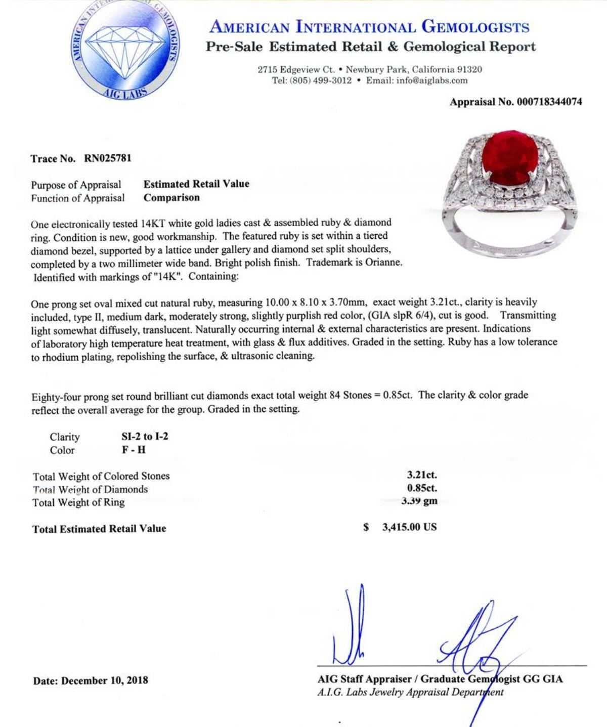 One electronically tested 14KT white gold ladies cast & assembled ruby & diamond ring. Condition is new, good workmanship. The featured ruby is set within a tiered diamond bezel, supported by a lattice under gallery and diamond set split shoulders, completed by a two millimeter wide band. Bright polish finish. Trademark is Orianne. Identified with markings of "14K". Containing: One prong set oval mixed cut natural ruby, measuring 10.00 x 8.10 x 3.70mm, exact weight 3.21ct., clarity is heavily included, type II, medium dark, moderately strong, slightly purplish red color, (GIA slpR 6/4), cut is good. Transmitting light somewhat diffusely, translucent. Naturally occurring internal & external characteristics are present. Indications of laboratory high temperature heat treatment, with glass & flux additives. Graded in the setting. Ruby has a low tolerance to rhodium plating, repolishing the surface, & ultrasonic cleaning. Eighty-four prong set round brilliant cut diamonds exact total weight 84 Stones = 0.85ctw. The clarity & color grade reflect the overall average for the group. Graded in the setting. Clarity SI-2 to I-2 Color F - H Total Weight of Colored Stones 3.21ct. Total Weight of Diamonds 0.85ctw. Total Weight of Ring 3.39 gm