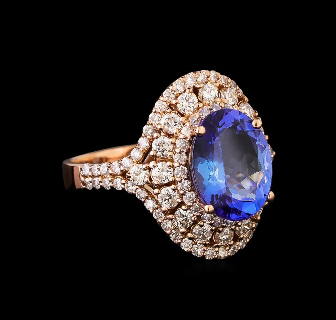 One electronically tested 14KT rose gold lady's cast fashion ring with a split shank triple basket halo with a bright polish finish. The featured lady's ring has a shank measuring 2.83 millimeters in width. Identified with markings of 'K14'. Condition is new, good workmanship. Containing: One prong set oval modified brilliant cut natural tanzanite, measuring 10.97 x 8.67 x 4.80mm, (depth est.) approximate weight of 3.21ct., clarity is eye clean, medium, very slightly grayish, violetish blue color, (GIA vB 5/3), cut is good. Transmitting light with no distortion, transparent. Colored gemstones are presumed to have been subjected to commonly used enhancement processes. Graded in the setting. Eighteen prong set round brilliant cut diamonds, measuring 2.10 - 2.00 x 1.27mm (depth est.) approximate total weight of 18 Stones = 0.60ct. Graded in the setting. Clarity SI-1 to I-1. Color: H - I Cut Good Seventy-Four prong set round brilliant cut diamonds, measuring 1.35 - 1.25 x 0.81mm (depth est.) approximate total weight of 74 Stones = 0.60ct. Graded in the setting. Clarity SI-1 to SI-2. Color: H - I Cut Good. Total Weight of Colored Stones 3.21ct.. Total Weight of Diamonds 1.20ct.. Total Weight of Ring 5.70gm. GAS Appraised at $9,070.00.