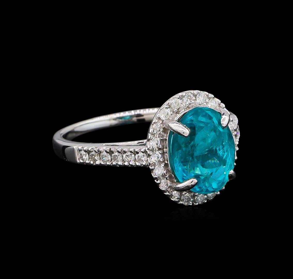 One electronically tested 14KT white gold lady's cast fashion ring with a cathedral halo with a bright polish finish. The featured ladies ring has a shank measuring 1.70 millimeters in width. Trademark is Orianne. Identified with markings of "14K". Condition is new, good workmanship. Containing: One prong set oval modified brilliant cut natural apatite, measuring 9.82 x 7.72 x 6.00mm, 5%. bulge factor, approximate weight of 3.23ct., clarity is moderately included, medium dark, moderately strong, bluish green color, (GIA bG 6/4), cut is good. Transmitting light with a minimum of distortion, transparent. Colored gemstones are presumed to have been subjected to commonly used enhancement processes. Graded in the setting. Twelve prong set round brilliant cut diamonds, measuring 1.60 - 1.50 x 0.98mm (depth est.) approximate total weight of 12 Stones = 0.18ct. Graded in the setting. Clarity: SI-2 to I-1. Color: H - I. Cut Good Twenty prong set round brilliant cut diamonds, measuring 1.30 - 1.20 x 0.79mm (depth est.) approximate total weight of 20 Stones = 0.15ct. Graded in the setting. Clarity: SI-2 to I-1. Color: H - I. Cut Good. Total Weight of Colored Stones 3.23ct. Total Weight of Diamonds 0.33ct. Total Weight of Ring 3.40gm. GAS Appraised at $3,480.00.