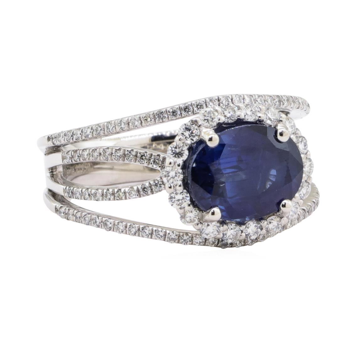 One electronically tested platinum ladies cast & assembled sapphire & diamond ring. The featured sapphire is set within a diamond bezel, supported by a ribbed under gallery, above diamond ribbons, completed by a frame of diamond ribbons and a four millimeter wide band. Identified with "PT950". Trademark is Orianne Condition is new, good workmanship. Containing: One prong set oval mixed cut natural blue sapphire, measuring 9.77 x 7.58 x 4.88mm, approximate weight of 3.23ct., clarity is moderately included, type II, dark, very slightly grayish, blue color, (GIA B 7/3), cut is good. Transmitting light with a minimum of distortion, transparent. Naturally occurring internal & external characteristics are present. Graded in the setting. One Hundred Twenty-Two prong set round brilliant cut diamonds approximate total weight of 122 Stones = 0.70ct. Graded in the setting. Clarity SI-1 to I-1 Color F - H Total Weight of Colored Stones 3.23 ct. Total Weight of Diamonds 0.70 ct. Total Weight of Ring 9.90 gm Estimated Retail Value $ 11,880.00 US