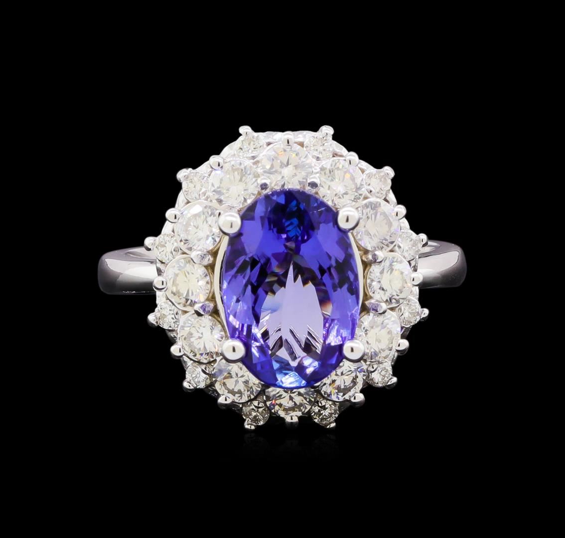 One electronically tested 14KT white gold lady's cast fashion ring with a double basket halo with a bright polish finish. The featured lady's ring has a shank measuring 2.69 millimeters in width. Identified with markings of "K14". Condition is new, good workmanship. Containing: One prong set oval modified brilliant cut natural tanzanite, measuring 11.15 x 7.91 x 4.58mm, (depth est.) 8%. bulge factor, approximate weight of 3.23ct., clarity is eye clean, medium, moderately strong, bluish violet color, (GIA bV 5/4), cut is good. Transmitting light with no distortion, transparent. Colored gemstones are presumed to have been subjected to commonly used enhancement processes. Graded in the setting. Twelve prong set round brilliant cut diamonds, measuring 2.95 - 2.90 x 1.76mm (depth est.) approximate total weight of 12 Stones = 1.00ct. Graded in the setting. Graded in the setting. Clarity: VS-2 to SI-1. Color: H - I. Cut Very Good Twelve prong set round brilliant cut diamonds, measuring 1.60 - 1.50 x 0.93mm (depth est.) approximate total weight of 12 Stones = 0.18ct. Graded in the setting. Clarity: SI-1 to SI-2. Color: H - I. Cut Good. Total Weight of Colored Stones 3.23ct. Total Weight of Diamonds 1.18ct. Total Weight of Ring 6.90gm. GAS Appraised at $8,730.00.