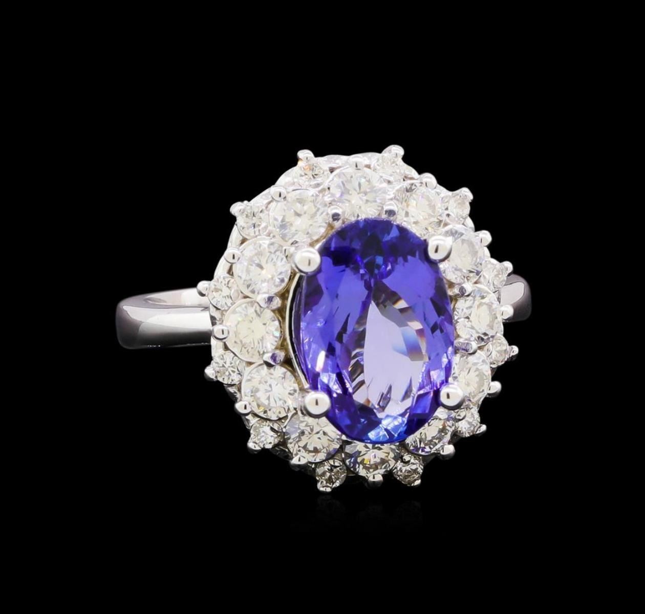 One electronically tested 14KT white gold lady's cast fashion ring with a double basket halo with a bright polish finish. The featured lady's ring has a shank measuring 2.69 millimeters in width. Identified with markings of "K14". Condition is new, good workmanship. Containing: One prong set oval modified brilliant cut natural tanzanite, measuring 11.15 x 7.91 x 4.58mm, (depth est.) 8%. bulge factor, approximate weight of 3.23ct., clarity is eye clean, medium, moderately strong, bluish violet color, (GIA bV 5/4), cut is good. Transmitting light with no distortion, transparent. Colored gemstones are presumed to have been subjected to commonly used enhancement processes. Graded in the setting. Twelve prong set round brilliant cut diamonds, measuring 2.95 - 2.90 x 1.76mm (depth est.) approximate total weight of 12 Stones = 1.00ct. Graded in the setting. Graded in the setting. Clarity: VS-2 to SI-1. Color: H - I. Cut Very Good Twelve prong set round brilliant cut diamonds, measuring 1.60 - 1.50 x 0.93mm (depth est.) approximate total weight of 12 Stones = 0.18ct. Graded in the setting. Clarity: SI-1 to SI-2. Color: H - I. Cut Good. Total Weight of Colored Stones 3.23ct. Total Weight of Diamonds 1.18ct. Total Weight of Ring 6.90gm. GAS Appraised.