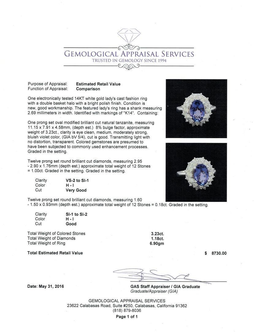 One electronically tested 14KT white gold lady's cast fashion ring with a double basket halo with a bright polish finish. The featured lady's ring has a shank measuring 2.69 millimeters in width. Identified with markings of "K14". Condition is new, good workmanship. Containing: One prong set oval modified brilliant cut natural tanzanite, measuring 11.15 x 7.91 x 4.58mm, (depth est.) 8%. bulge factor, approximate weight of 3.23ct., clarity is eye clean, medium, moderately strong, bluish violet color, (GIA bV 5/4), cut is good. Transmitting light with no distortion, transparent. Colored gemstones are presumed to have been subjected to commonly used enhancement processes. Graded in the setting. Twelve prong set round brilliant cut diamonds, measuring 2.95 - 2.90 x 1.76mm (depth est.) approximate total weight of 12 Stones = 1.00 ct. Graded in the setting. Graded in the setting. Clarity: VS-2 to SI-1. Color: H - I. Cut Very Good Twelve prong set round brilliant cut diamonds, measuring 1.60 - 1.50 x 0.93mm (depth est.) approximate total weight of 12 Stones = 0.18ct. Graded in the setting. Clarity: SI-1 to SI-2. Color: H - I. Cut Good. Total Weight of Colored Stones 3.23ct. Total Weight of Diamonds 1.18ct. Total Weight of Ring 6.90gm. GAS Appraised.