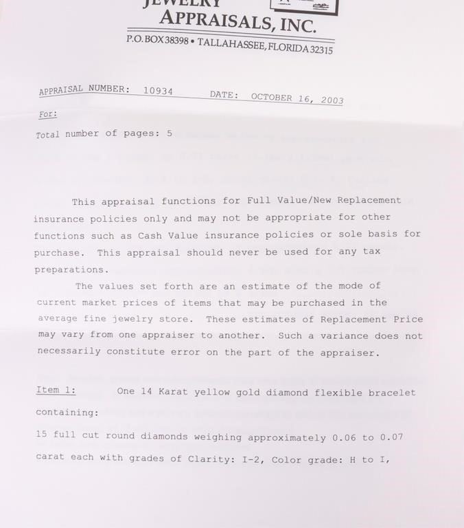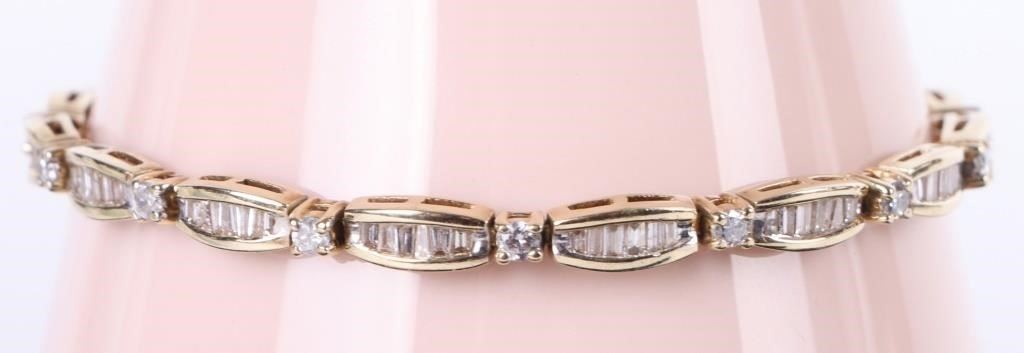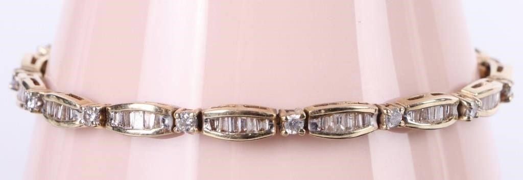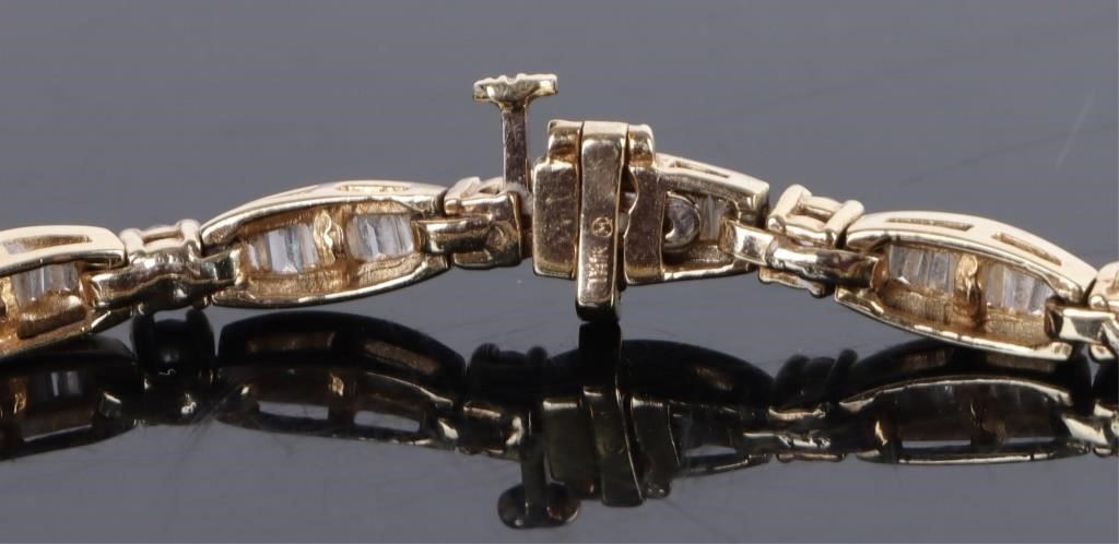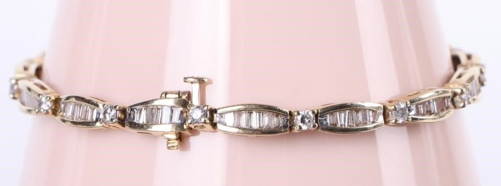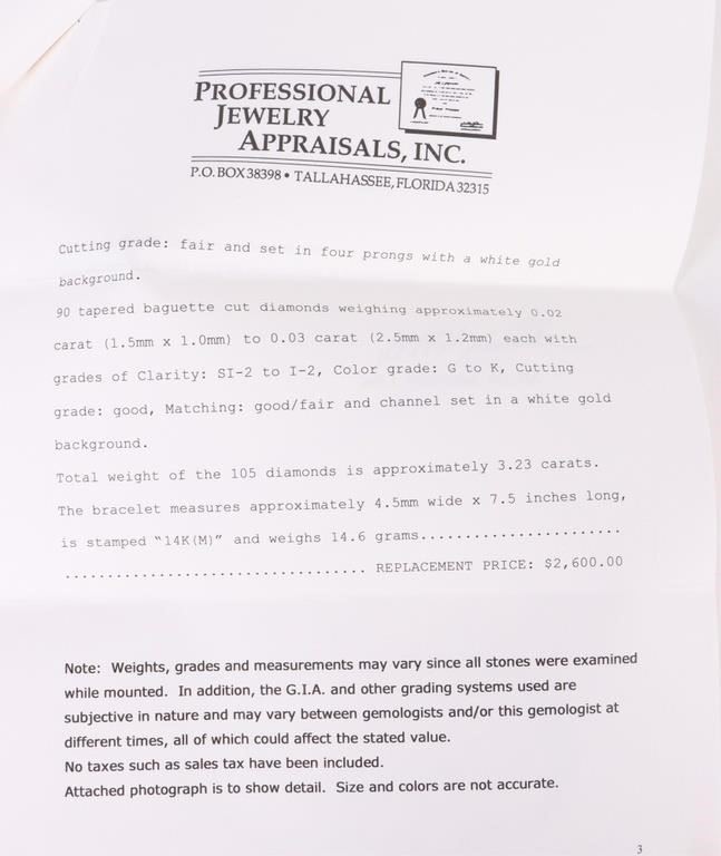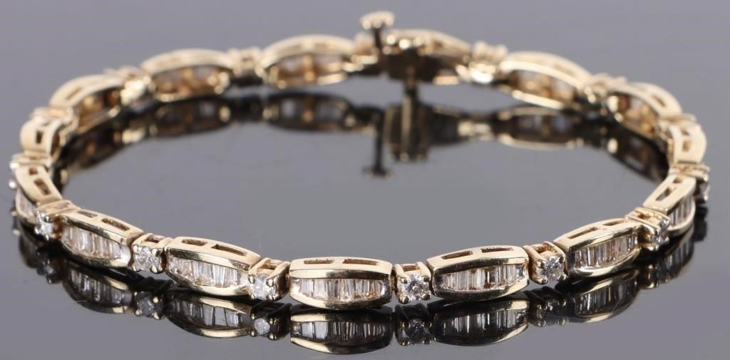 3.23ctw diamond 14k yellow bracelet with appraisal. Entire bracelet has ninety 0.02-0.03ct tapered channel diamonds and fifteen 0.06-0.07ct round diamonds.