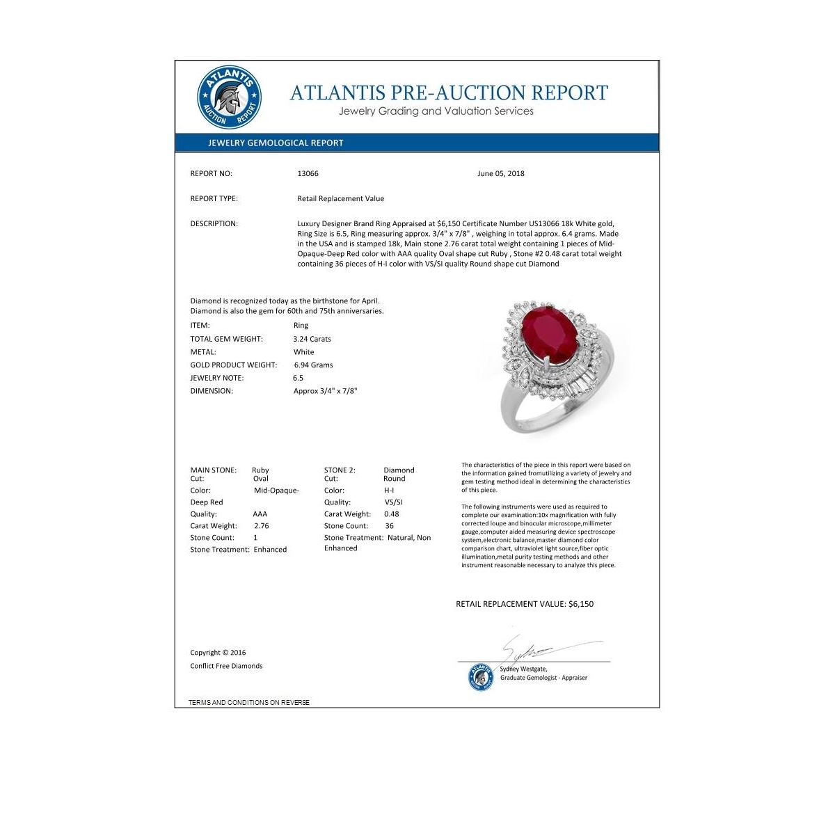 REF-85X8T -13066 ---- 3.24 CTW Ruby & Diamond Ring 18K White Gold ---- Luxury Designer Brand Ring Appraised at $6,150 Certificate Number US13066 18k White gold, Ring Size is 6.5, Ring measuring approx. 3/4" x 7/8" , weighing in total approx. 6.4 grams. Made in the USA and is stamped 18k, Main stone 2.76 carat total weight containing 1 pieces of Mid-Opaque-Deep Red color with AAA quality Oval shape cut Ruby , Stone #2 0.48 carat total weight containing 36 pieces of H-I color with VS/SI quality Round shape cut Diamond
