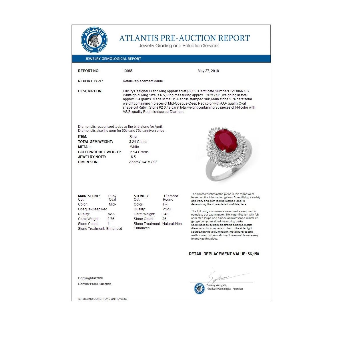 REF-85X8T -13066 ---- 3.24 CTW Ruby & Diamond Ring 18K White Gold ---- Luxury Designer Brand Ring Appraised at $6,150 Certificate Number US13066 18k White gold, Ring Size is 6.5, Ring measuring approx. 3/4" x 7/8" , weighing in total approx. 6.4 grams. Made in the USA and is stamped 18k, Main stone 2.76 carat total weight containing 1 pieces of Mid-Opaque-Deep Red color with AAA quality Oval shape cut Ruby , Stone #2 0.48 carat total weight containing 36 pieces of H-I color with VS/SI quality Round shape cut Diamond