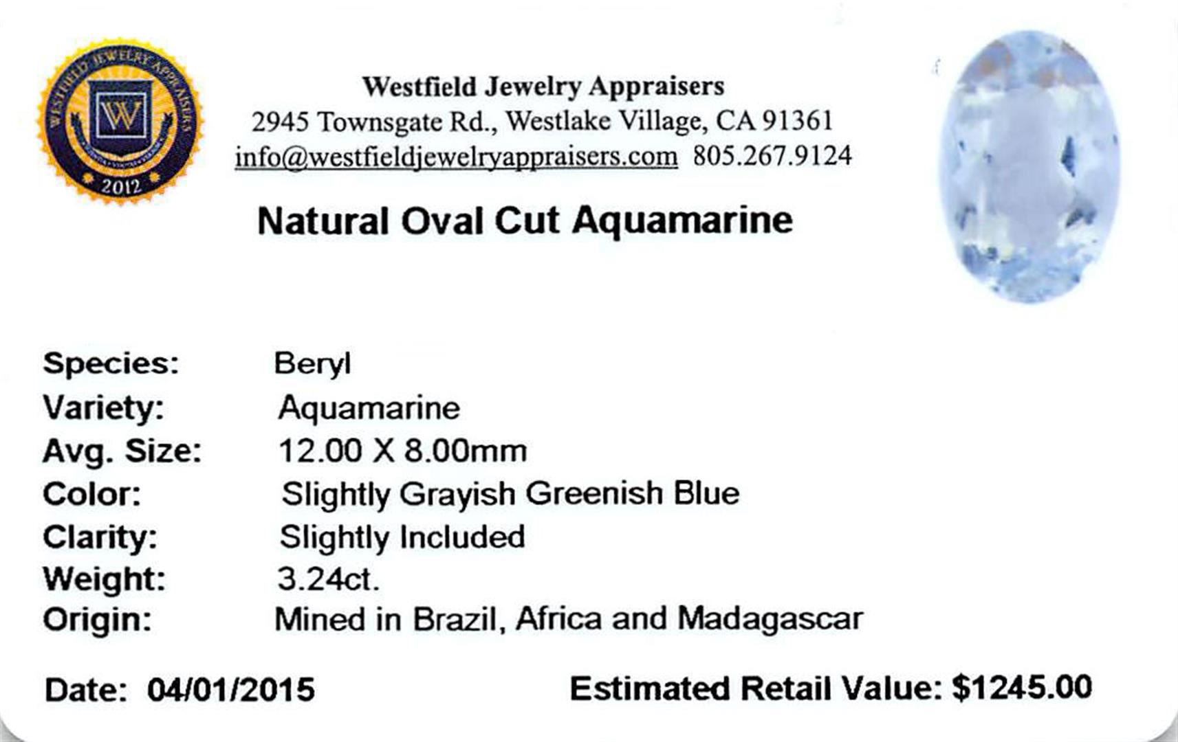 One oval cut natural aquamarine exact weight 3.24ct., clarity is eye clean, type I, medium, slightly grayish, very slightly greenish blue color, (GIA vslgB 5/2), cut is good. Westfield Appraised at $1,245.00.