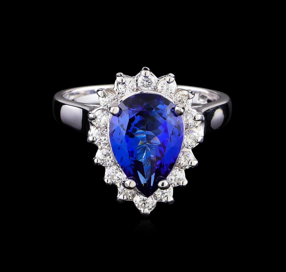 One electronically tested 14KT white gold lady's cast fashion ring with a basket halo with a bright polish finish. The featured lady's ring has a shank measuring 2.29 millimeters in width. Identified with markings of "14K". Condition is new, good workmanship. Containing: One prong set oval pear modified brilliant cut natural tanzanite, measuring 11.67 x 8.12 x 5.20mm, (depth est.) approximate weight of 3.24ct., clarity is eye clean, medium dark, moderately strong, bluish violet color, (GIA bV 6/4), cut is very good. Transmitting light with no distortion, transparent. Colored gemstones are presumed to have been subjected to commonly used enhancement processes. Graded in the setting. Sixteen pave' set round brilliant cut diamonds, measuring 2.05 - 1.95 x 1.20mm (depth est.) approximate total weight of 16 Stones = 0.47ct. Graded in the setting. Clarity: SI-1 to SI-2. Color: H - I. Cut Good. Total Weight of Colored Stones 3.24ct. Total Weight of Diamonds 0.47ct. Total Weight of Ring 5.60gm. GAS Appraised at $7,345.00.