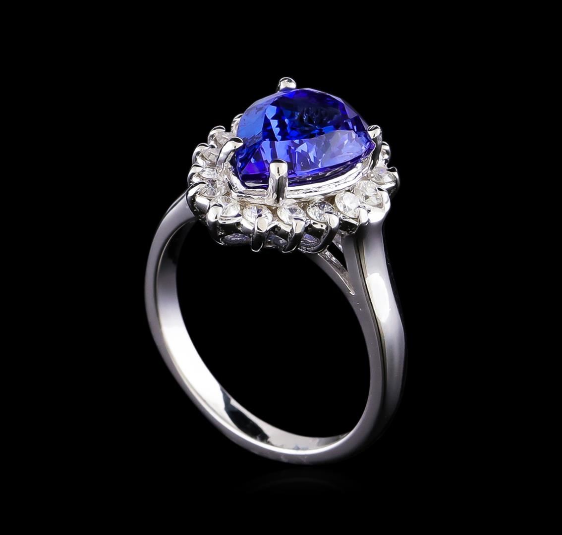 One electronically tested 14KT white gold lady's cast fashion ring with a basket halo with a bright polish finish. The featured lady's ring has a shank measuring 2.29 millimeters in width. Identified with markings of "14K". Condition is new, good workmanship. Containing: One prong set oval pear modified brilliant cut natural tanzanite, measuring 11.67 x 8.12 x 5.20mm, (depth est.) approximate weight of 3.24ct., clarity is eye clean, medium dark, moderately strong, bluish violet color, (GIA bV 6/4), cut is very good. Transmitting light with no distortion, transparent. Colored gemstones are presumed to have been subjected to commonly used enhancement processes. Graded in the setting. Sixteen pave' set round brilliant cut diamonds, measuring 2.05 - 1.95 x 1.20mm (depth est.) approximate total weight of 16 Stones = 0.47ct. Graded in the setting. Clarity: SI-1 to SI-2. Color: H - I. Cut Good. Total Weight of Colored Stones 3.24ct. Total Weight of Diamonds 0.47ct. Total Weight of Ring 5.60gm. GAS Appraised at $7,345.00.